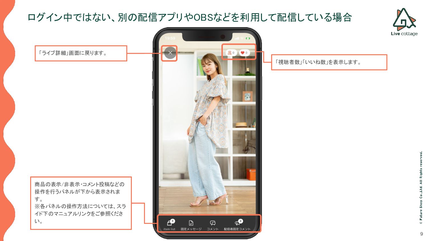 9 ログイン中ではない、別の配信アプリやOBSなどを利用して配信している場合 「ライブ詳細」画面に戻ります。 「視聴者数」「いいね数」を表示します。 商品の表示/非表示・コメント投稿などの 操作を行うパネルが下から表示されま