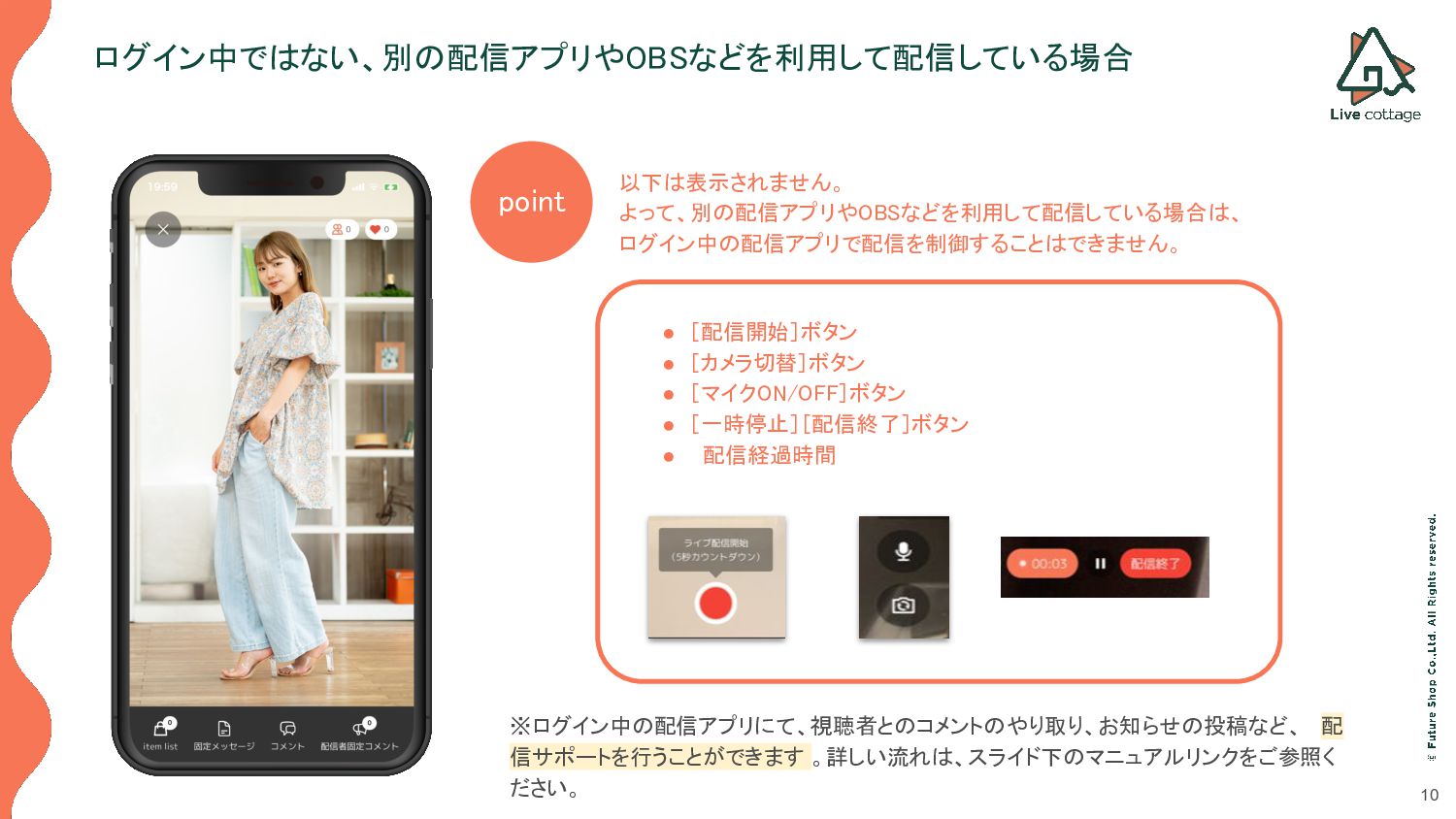 [マイクON/OFF]ボタン • [一時停止][配信終了]ボタン • 配信経過時間 point 以下は表示されません。 よって、別の配信アプリやOBSなどを利用して配信している場合は、 ログイン中の配信アプリで配信を制御することはできません。 ※ログイン中の配信アプリにて、視聴者とのコメントのやり取り、お知らせの投稿など、 配 信サポートを行うことができます 。詳しい流れは、スライド下のマニュアルリンクをご参照く ださい。