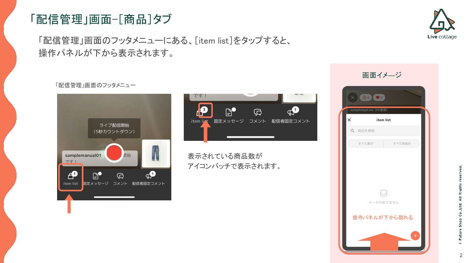 2 「配信管理」画面のフッタメニュー 「配信管理」画面のフッタメニューにある、[item list]をタップすると、 操作パネルが下から表示されます。 表示されている商品数が アイコンバッチで表示されます。 「配信管理」画面-[商品]タブ