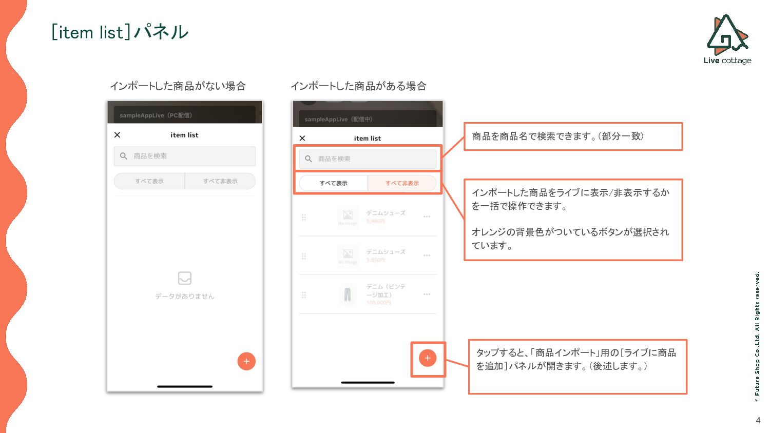 4 [item list]パネル インポートした商品がない場合 インポートした商品がある場合 タップすると、「商品インポート」用の[ライブに商品 を追加]パネルが開きます。(後述します。) インポートした商品をライブに表示/非表示するか を一括で操作できます。
