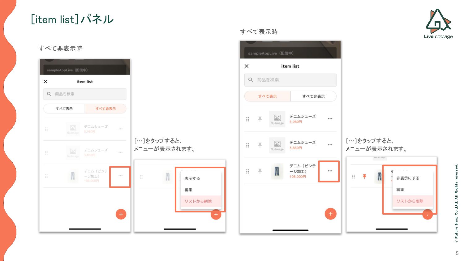 5 [item list]パネル すべて表示時 […]をタップすると、 メニューが表示されます。 すべて非表示時 […]をタップすると、 メニューが表示されます。