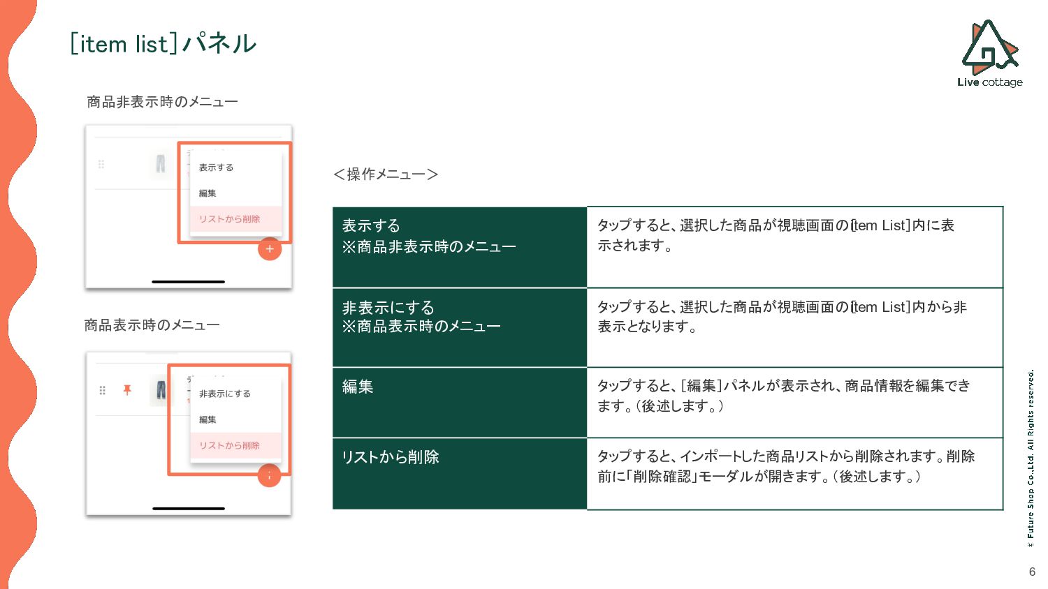 6 [item list]パネル 商品表示時のメニュー 商品非表示時のメニュー 表示する ※商品非表示時のメニュー タップすると、選択した商品が視聴画面の[ item List]内に表