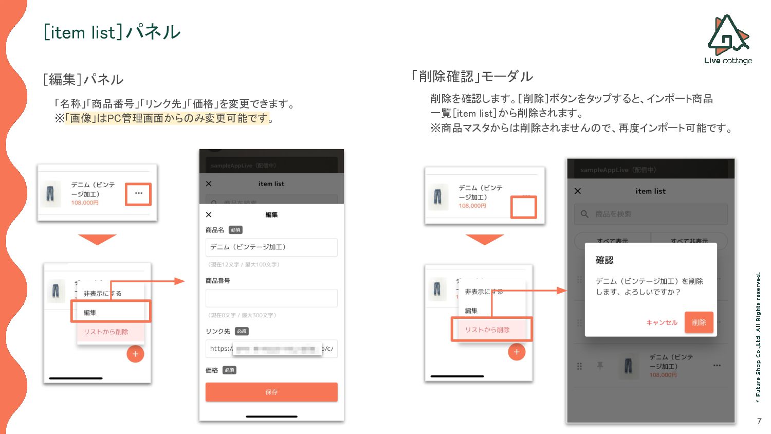 7 [item list]パネル [編集]パネル 「削除確認」モーダル 「名称」「商品番号」「リンク先」「価格」を変更できます。 ※「画像」はPC管理画面からのみ変更可能です。 削除を確認します。[削除]ボタンをタップすると、インポート商品