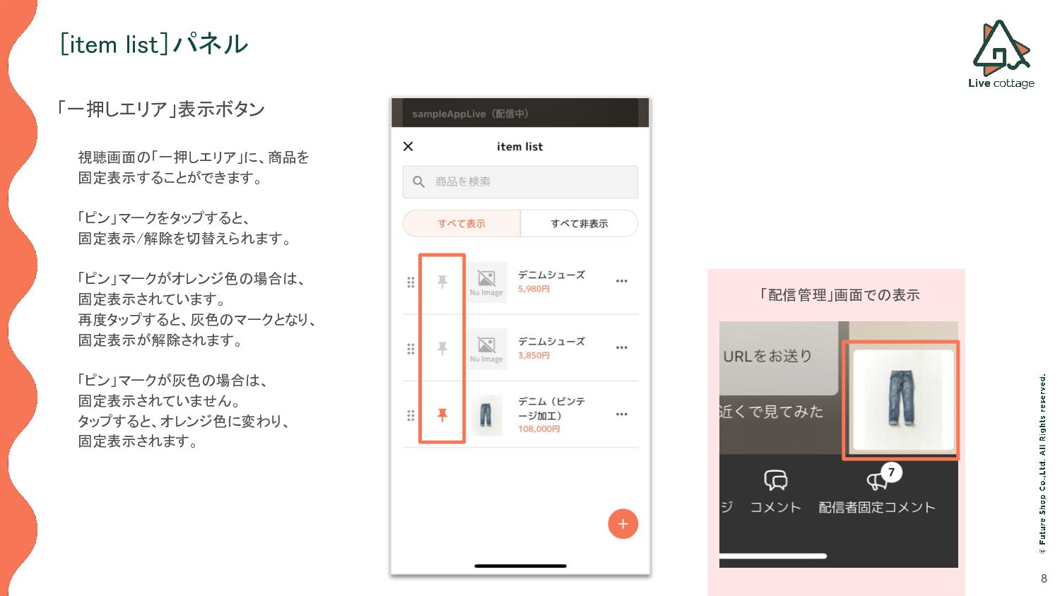 8 [item list]パネル 「一押しエリア」表示ボタン 視聴画面の「一押しエリア」に、商品を 固定表示することができます。 「ピン」マークをタップすると、