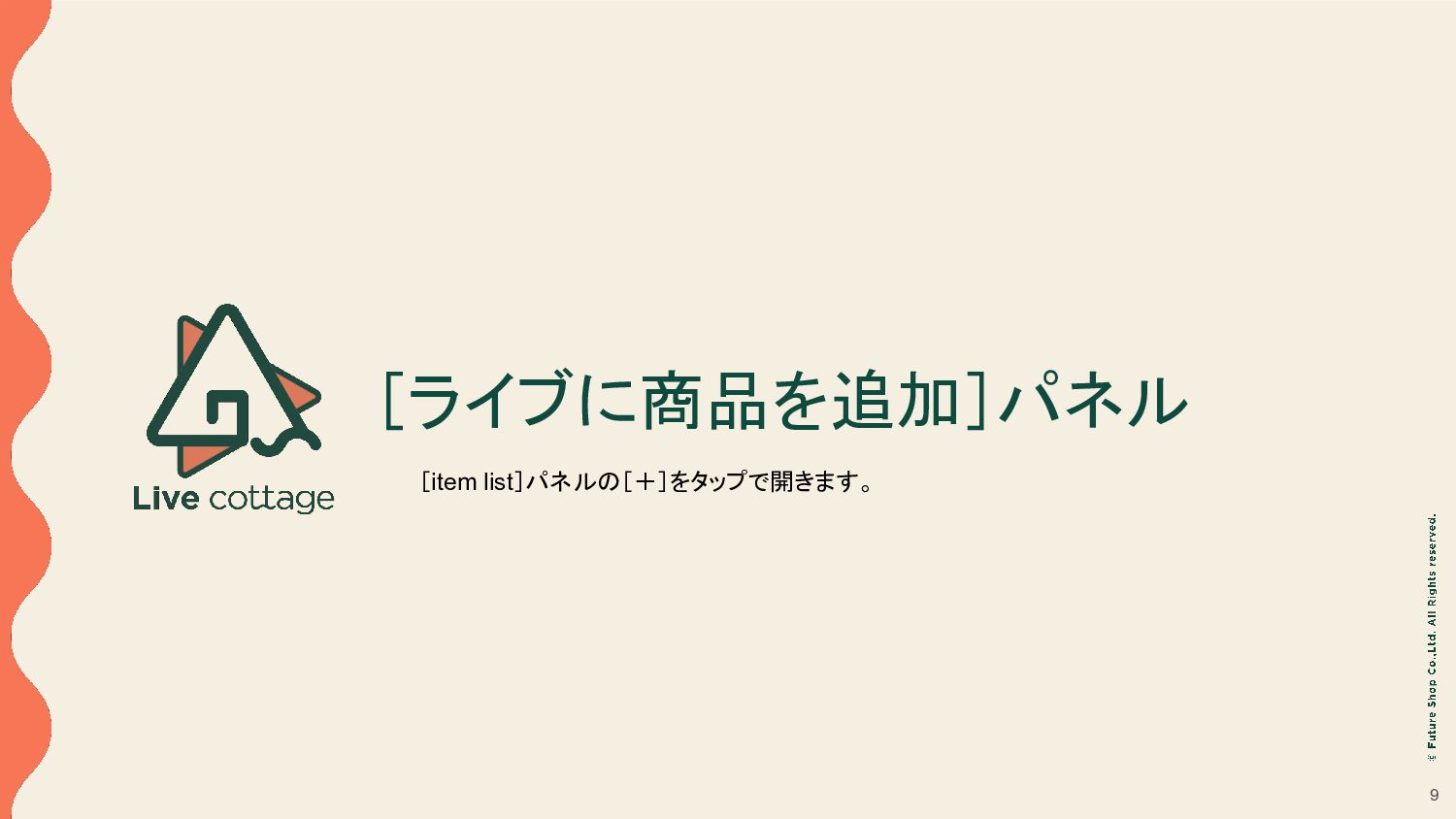 9 [ライブに商品を追加]パネル [item list]パネルの[+]をタップで開きます。