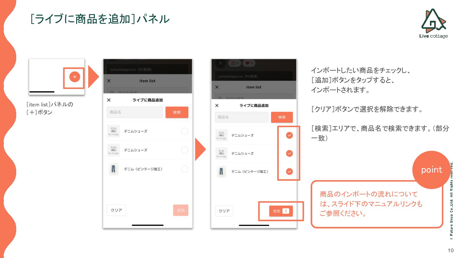 [検索]エリアで、商品名で検索できます。(部分 一致) [ライブに商品を追加]パネル 商品のインポートの流れについて は、スライド下のマニュアルリンクも ご参照ください。 point [item list]パネルの [+]ボタン