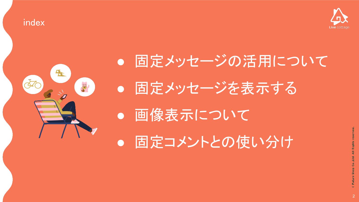 2 • 固定メッセージの活用について • 固定メッセージを表示する • 画像表示について • 固定コメントとの使い分け index