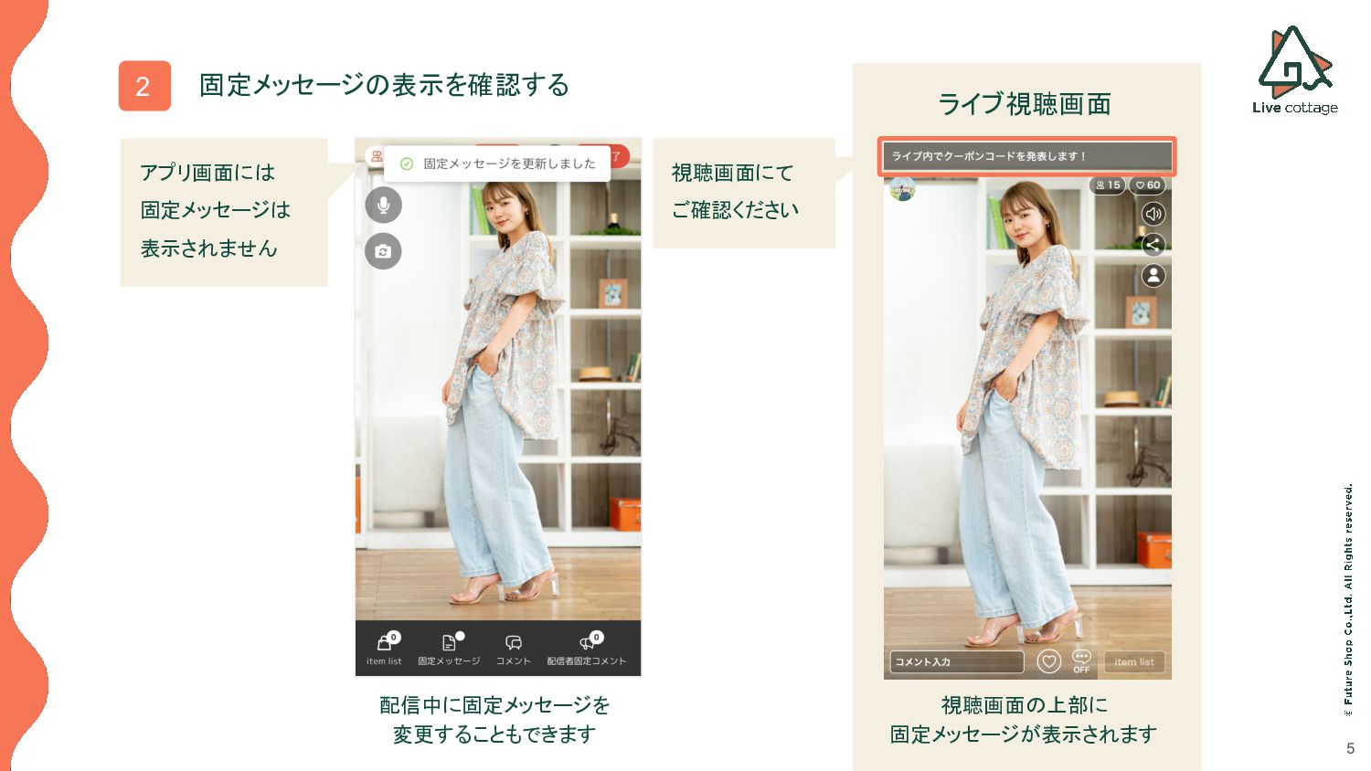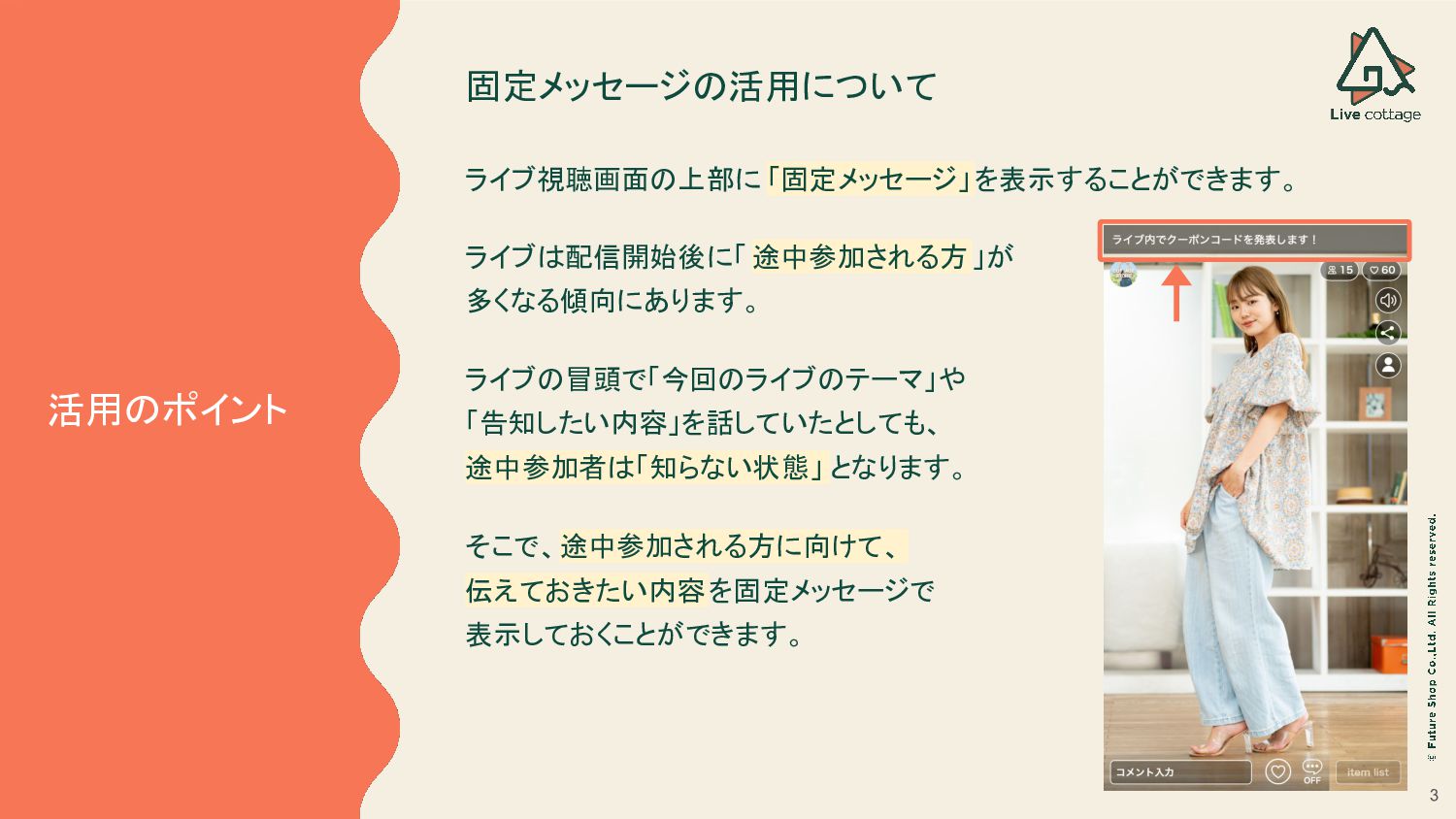 3 ライブは配信開始後に「 途中参加される方」が 多くなる傾向にあります。 活用のポイント 固定メッセージの活用について ライブの冒頭で「今回のライブのテーマ」や 「告知したい内容」を話していたとしても、