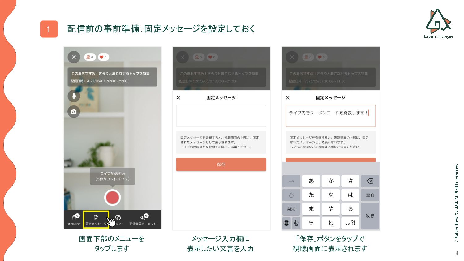 4 画面下部のメニューを タップします メッセージ入力欄に 表示したい文言を入力 1 配信前の事前準備:固定メッセージを設定しておく 「保存」ボタンをタップで 視聴画面に表示されます
