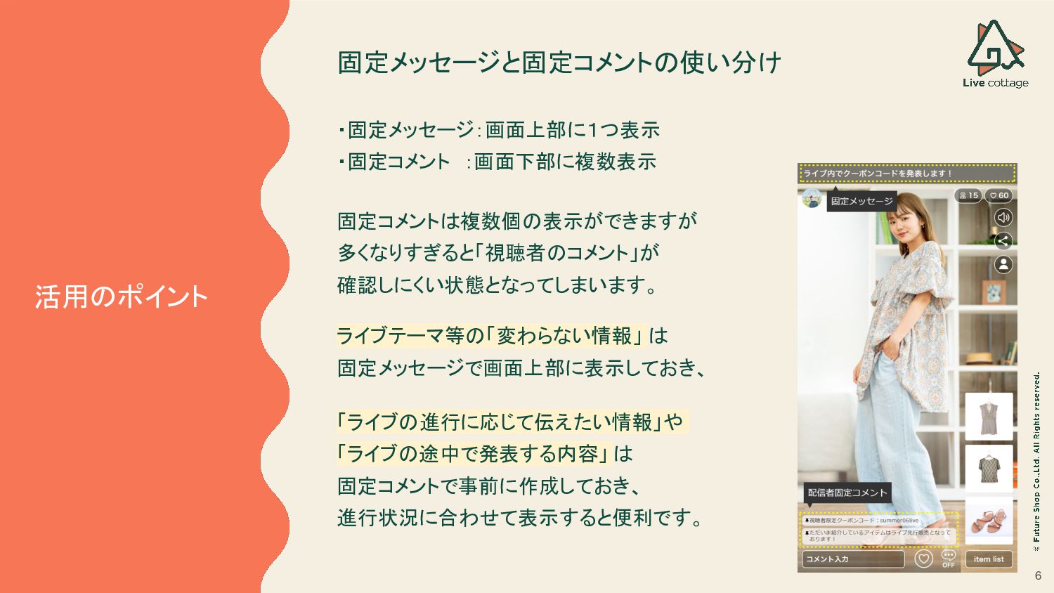 6 固定コメントは複数個の表示ができますが 多くなりすぎると「視聴者のコメント」が 確認しにくい状態となってしまいます。 活用のポイント 固定メッセージと固定コメントの使い分け ライブテーマ等の「変わらない情報」