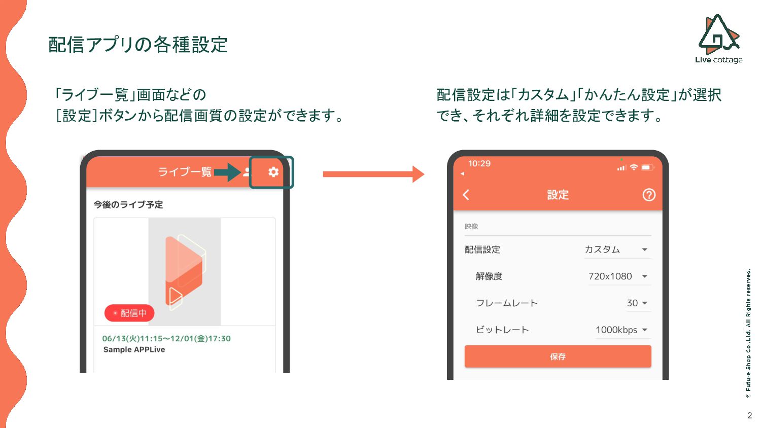 2 配信アプリの各種設定 1 「ライブ一覧」画面などの [設定]ボタンから配信画質の設定ができます。