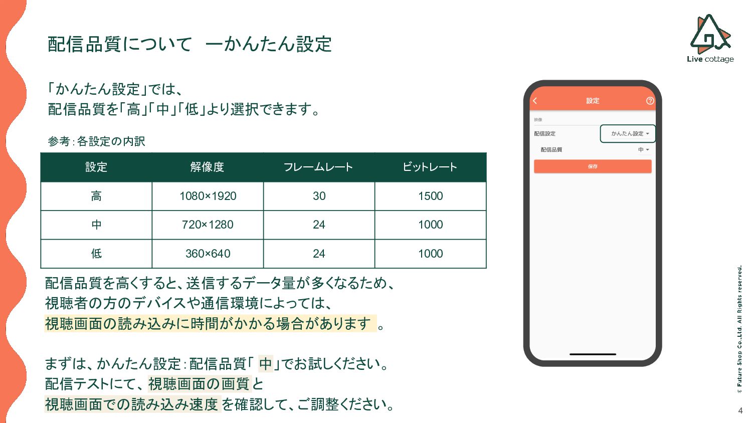 4 配信品質について ーかんたん設定 1 配信品質を高くすると、送信するデータ量が多くなるため、 視聴者の方のデバイスや通信環境によっては、