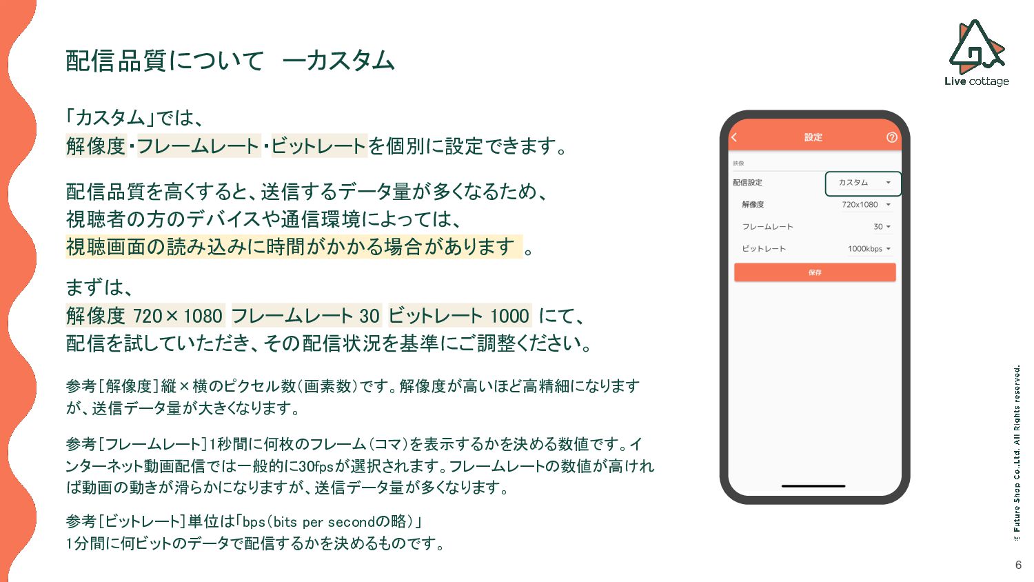 6 「カスタム」では、 解像度・フレームレート・ビットレートを個別に設定できます。 参考[解像度]縦×横のピクセル数(画素数)です。解像度が高いほど高精細になります が、送信データ量が大きくなります。 参考[フレームレート]1秒間に何枚のフレーム(コマ)を表示するかを決める数値です。イ ンターネット動画配信では一般的に30fpsが選択されます。フレームレートの数値が高けれ ば動画の動きが滑らかになりますが、送信データ量が多くなります。