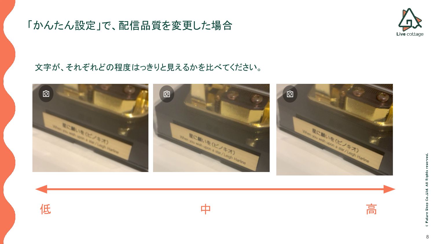 8 「かんたん設定」で、配信品質を変更した場合 1 低 文字が、それぞれどの程度はっきりと見えるかを比べてください。 中 高