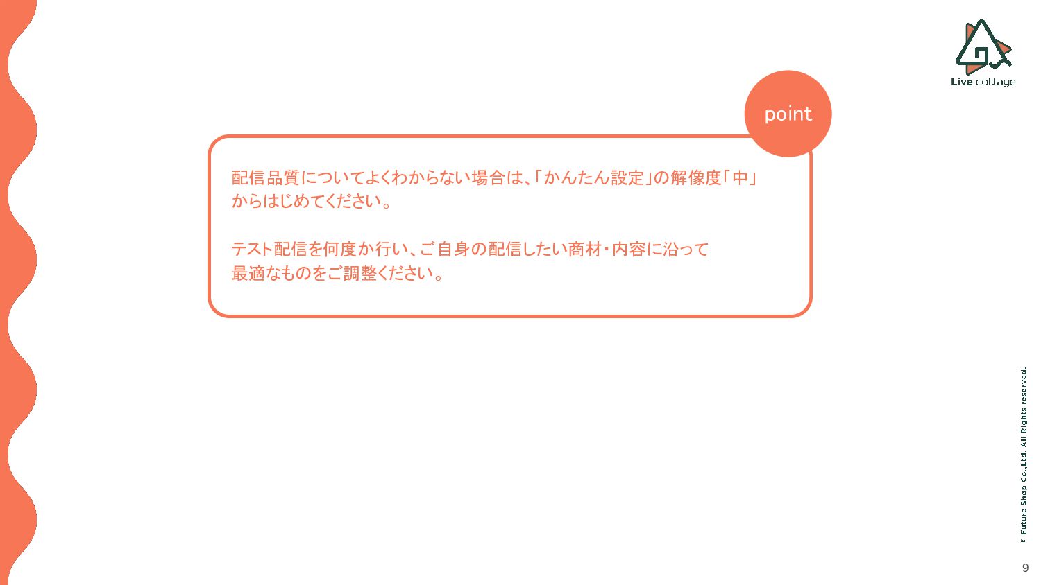9 配信品質についてよくわからない場合は、「かんたん設定」の解像度「中」 からはじめてください。 テスト配信を何度か行い、ご自身の配信したい商材・内容に沿って 最適なものをご調整ください。 point
