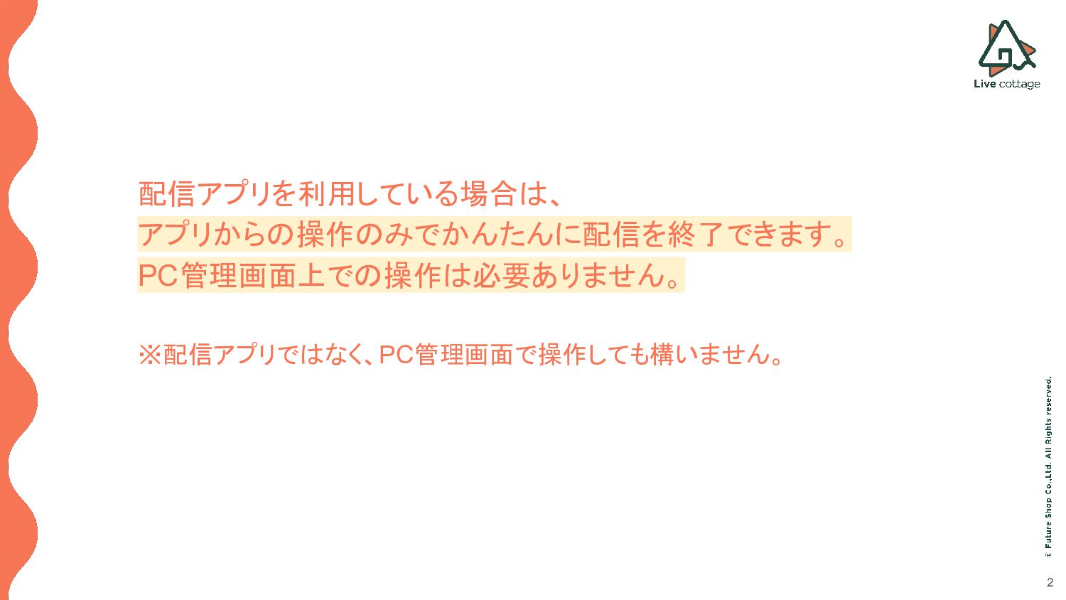2 配信アプリを利用している場合は、 アプリからの操作のみでかんたんに配信を終了できます。 PC管理画面上での操作は必要ありません。 ※配信アプリではなく、PC管理画面で操作しても構いません。