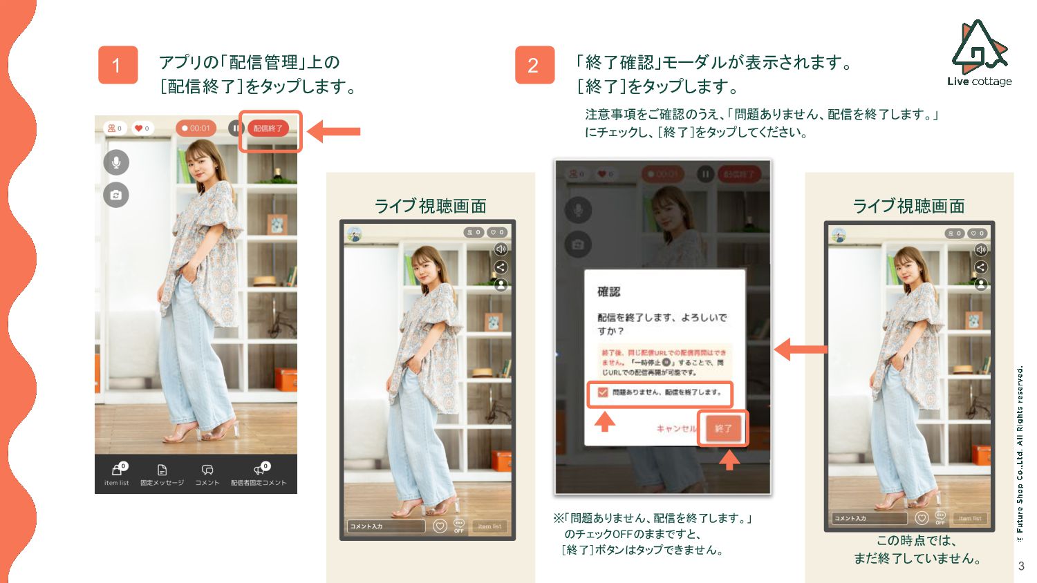 そこで、[配信終了]ボタンをタップする前には、 意図的に10秒ほど、途切れても問題のない、無音の映像の「間」をとってください。 例えば、「笑顔で手を振っている映像で約10秒」「お辞儀をした状態で約10秒間静止」「一押し商品 をクローズアップして約10秒間静止」など、 終了前の映像を適宜工夫してください。
