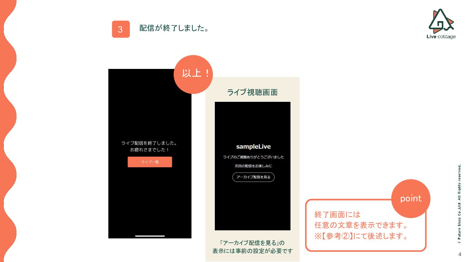 4 3 配信が終了しました。 ライブ視聴画面 「アーカイブ配信を見る」の 表示には事前の設定が必要です 以上! 終了画面には 任意の文章を表示できます。 ※【参考②】にて後述します。