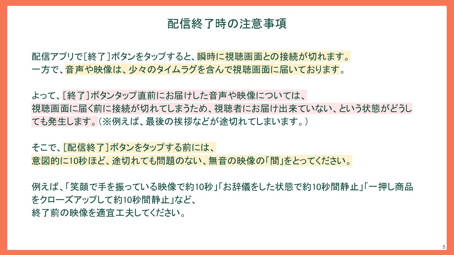 5 配信終了時の注意事項 配信アプリで[終了]ボタンをタップすると、瞬時に視聴画面との接続が切れます。 一方で、音声や映像は、少々のタイムラグを含んで視聴画面に届いております。 よって、[終了]ボタンタップ直前にお届けした音声や映像については、 視聴画面に届く前に接続が切れてしまうため、視聴者にお届け出来ていない、という状態がどうし ても発生します。(※例えば、最後の挨拶などが途切れてしまいます。)