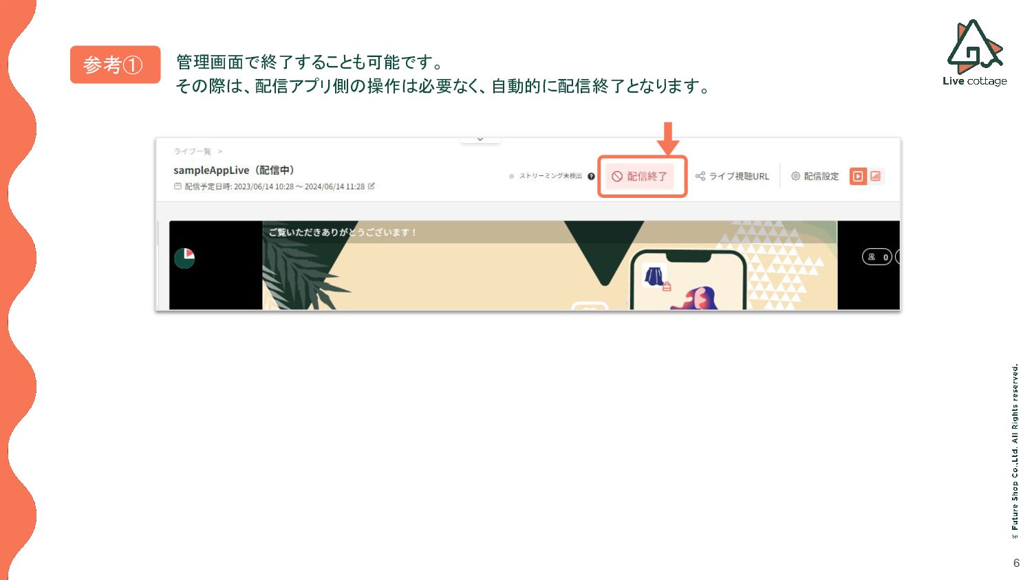 6 参考① 管理画面で終了することも可能です。 その際は、配信アプリ側の操作は必要なく、自動的に配信終了となります。