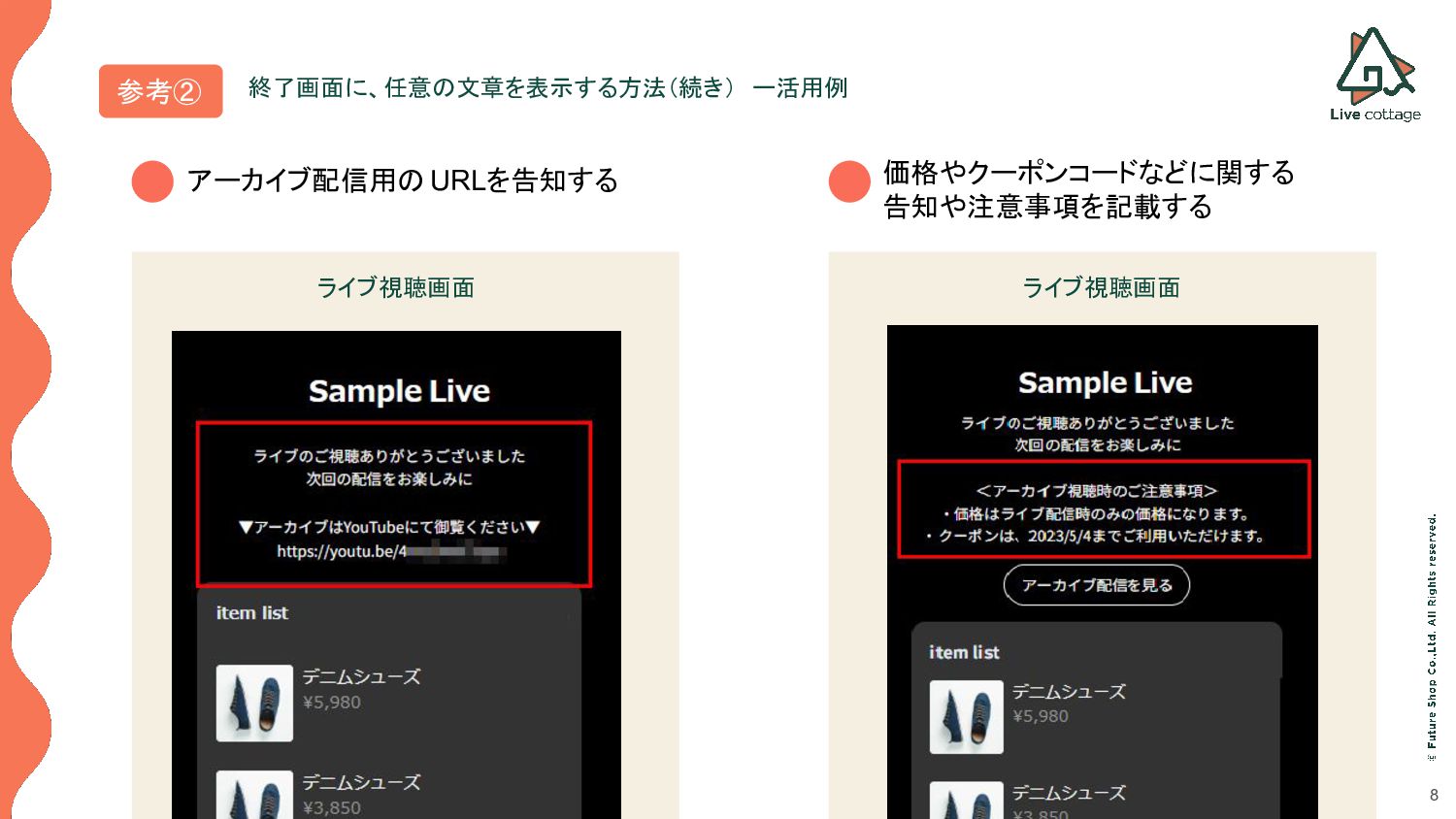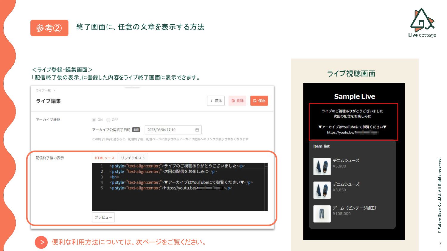 8 終了画面に、任意の文章を表示する方法(続き) ー活用例 ライブ視聴画面 アーカイブ配信用の URLを告知する 価格やクーポンコードなどに関する 告知や注意事項を記載する ライブ視聴画面 参考②