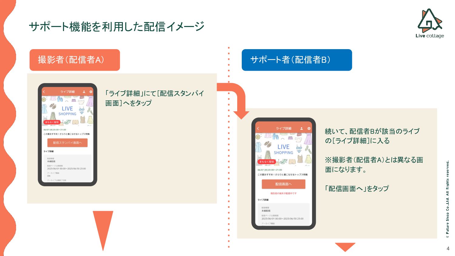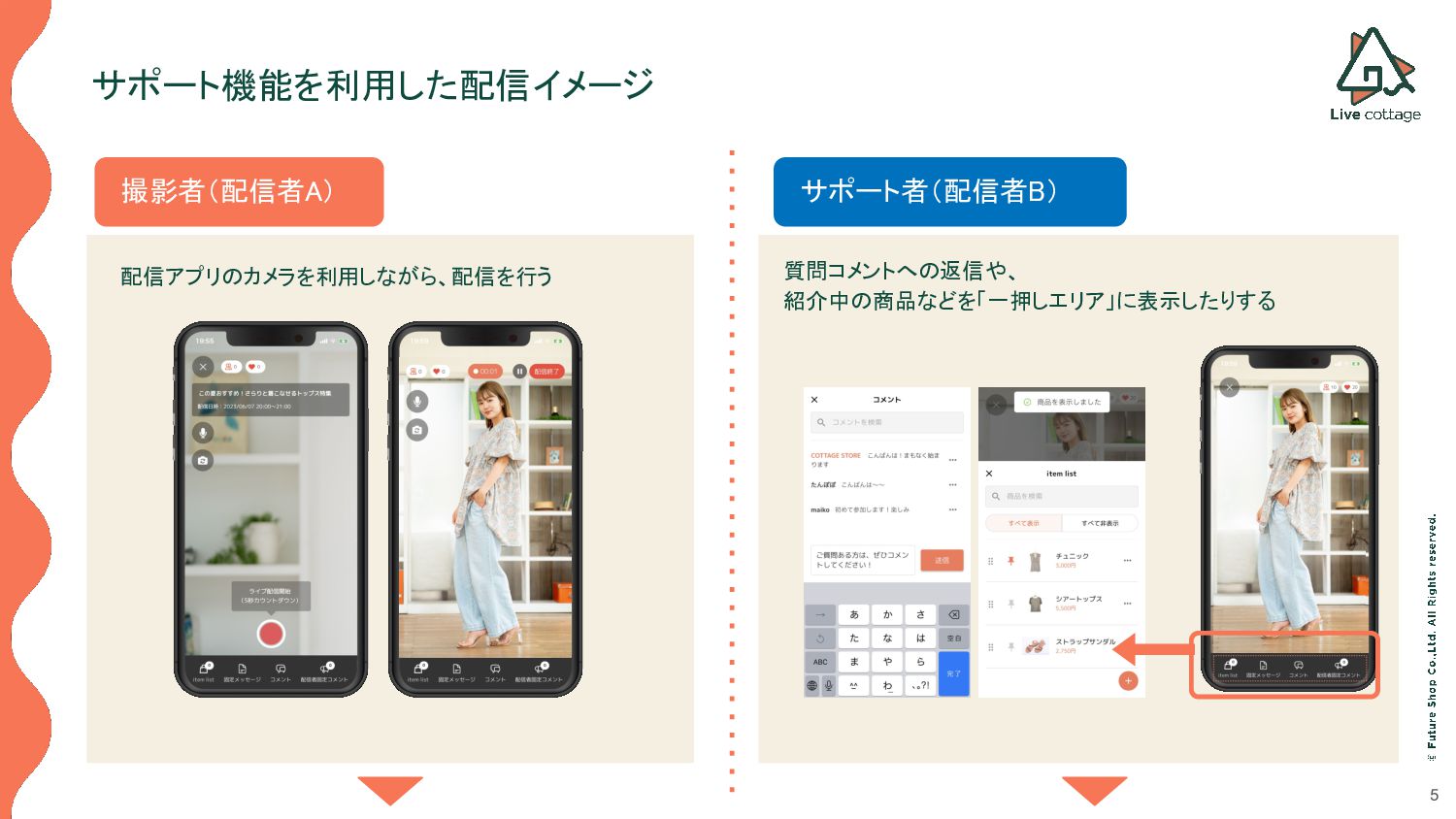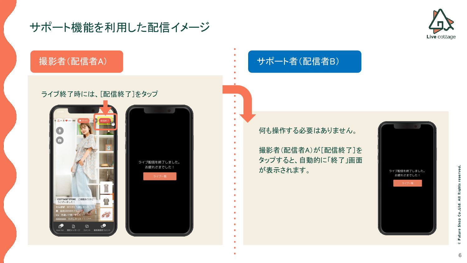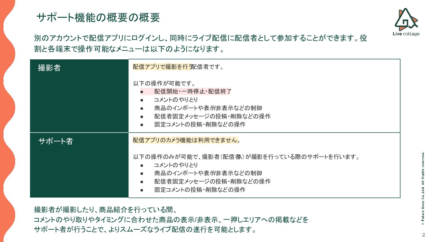 コメントのやりとり • 商品のインポートや表示 /非表示などの制御 • 配信者固定メッセージの投稿・削除などの操作 • 固定コメントの投稿・削除などの操作 サポート者 配信アプリのカメラ機能は利用できません。 以下の操作のみが可能で、撮影者(配信者 A)が撮影を行っている際のサポートを行います。 • コメントのやりとり • 商品のインポートや表示 /非表示などの制御 • 配信者固定メッセージの投稿・削除などの操作 • 固定コメントの投稿・削除などの操作 サポート機能の概要の概要 撮影者が撮影したり、商品紹介を行っている間、 コメントのやり取りやタイミングに合わせた商品の表示/非表示、一押しエリアへの掲載などを サポート者が行うことで、よりスムーズなライブ配信の進行を可能とします。