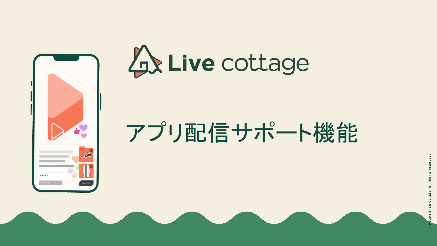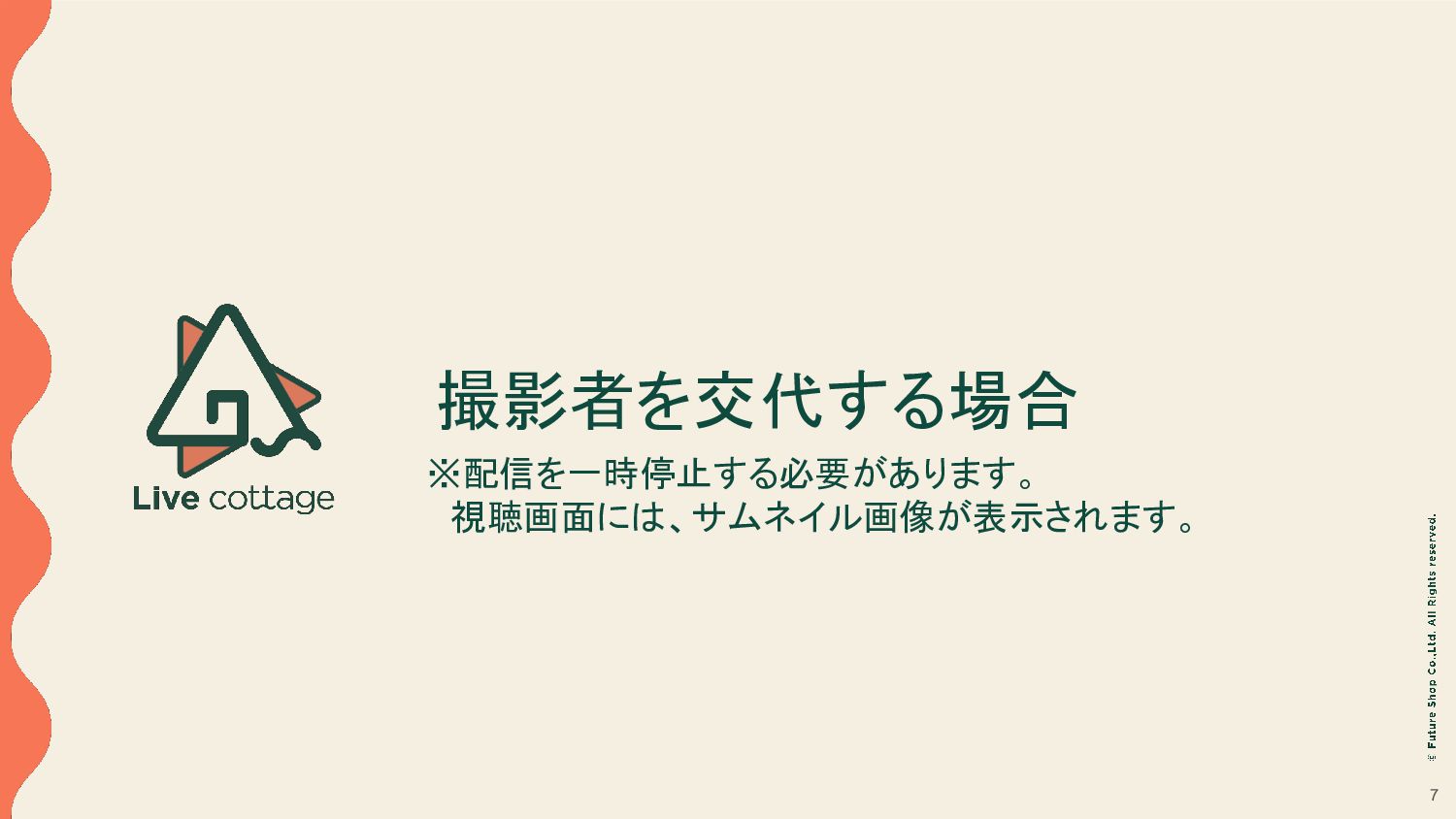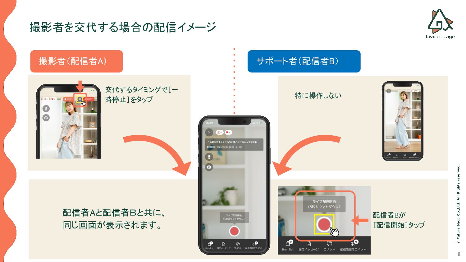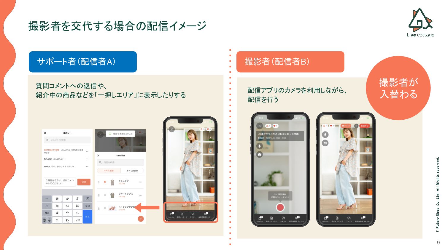 コメントのやりとり • 商品のインポートや表示 /非表示などの制御 • 配信者固定メッセージの投稿・削除などの操作 • 固定コメントの投稿・削除などの操作 サポート者 配信アプリのカメラ機能は利用できません。 以下の操作のみが可能で、撮影者(配信者 A)が撮影を行っている際のサポートを行います。 • コメントのやりとり • 商品のインポートや表示 /非表示などの制御 • 配信者固定メッセージの投稿・削除などの操作 • 固定コメントの投稿・削除などの操作 サポート機能の概要の概要 撮影者が撮影したり、商品紹介を行っている間、 コメントのやり取りやタイミングに合わせた商品の表示/非表示、一押しエリアへの掲載などを サポート者が行うことで、よりスムーズなライブ配信の進行を可能とします。