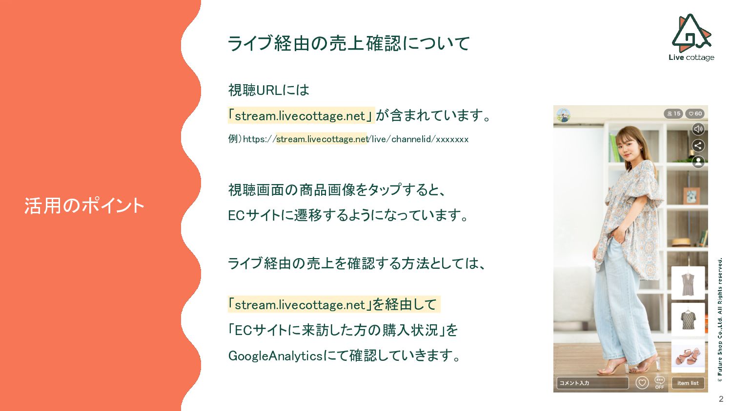 2 視聴画面の商品画像をタップすると、 ECサイトに遷移するようになっています。 活用のポイント ライブ経由の売上確認について ライブ経由の売上を確認する方法としては、 視聴URLには