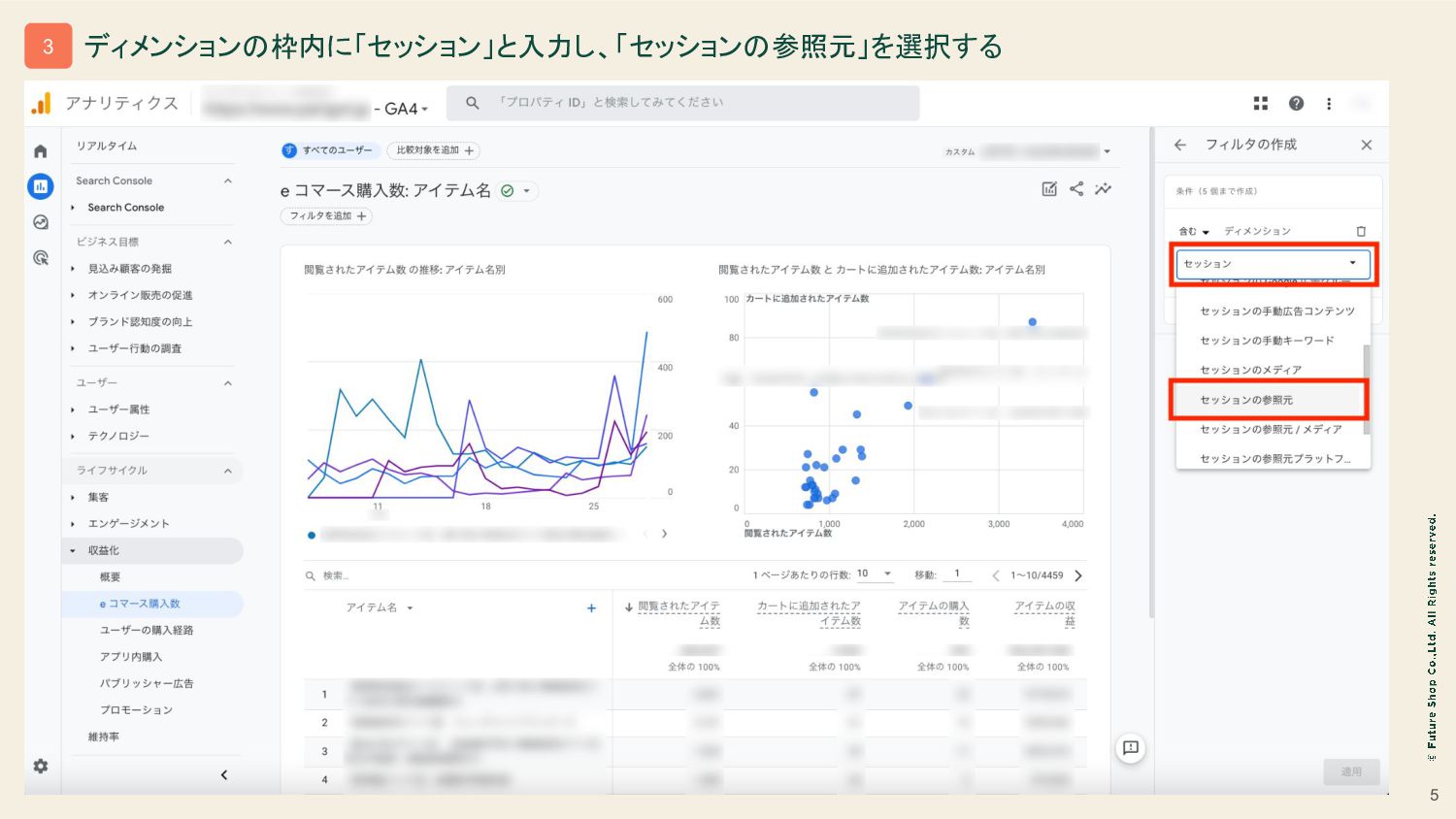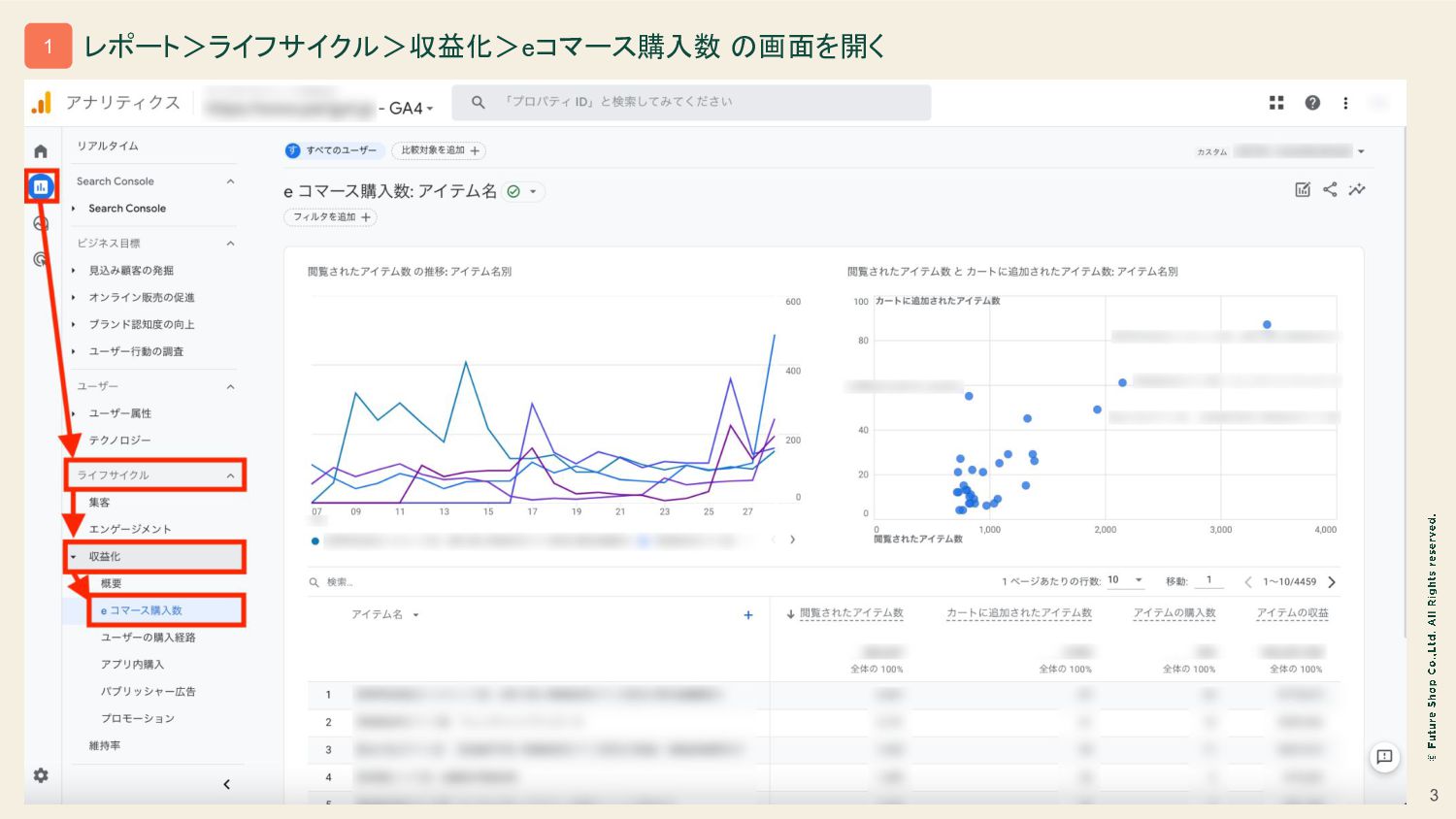 3 レポート>ライフサイクル>収益化>eコマース購入数 の画面を開く 1
