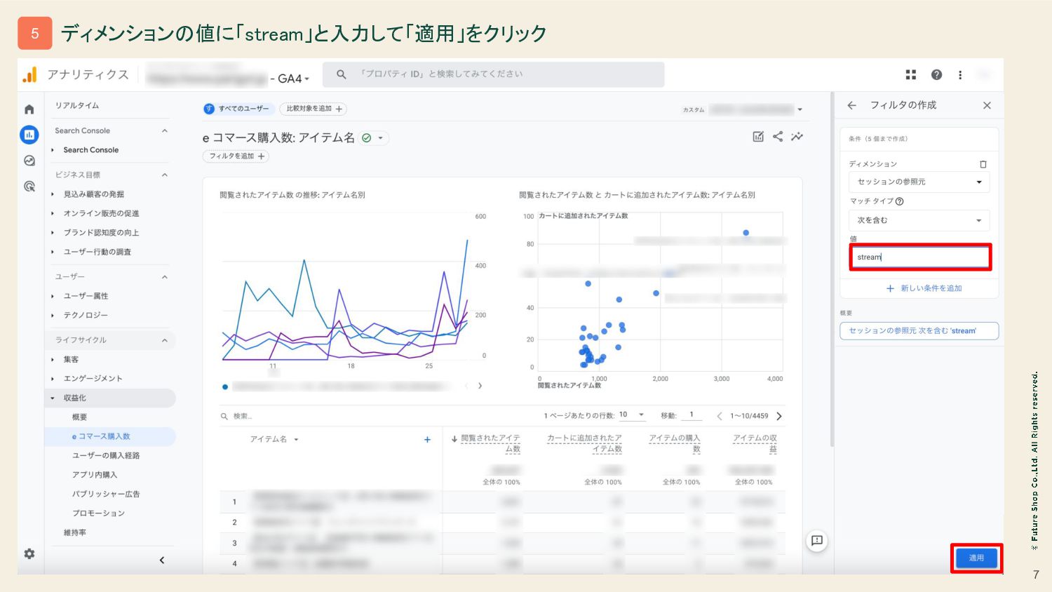 7 ディメンションの値に「stream」と入力して「適用」をクリック 5 チェックを入れて、 「OK」をクリック