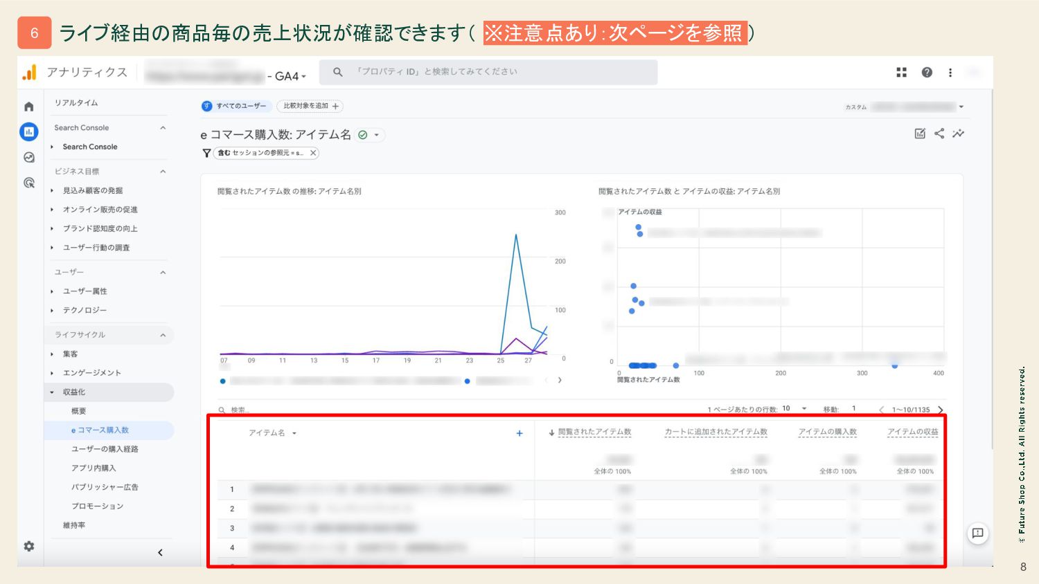 8 ライブ経由の商品毎の売上状況が確認できます( ※注意点あり:次ページを参照 ) 6