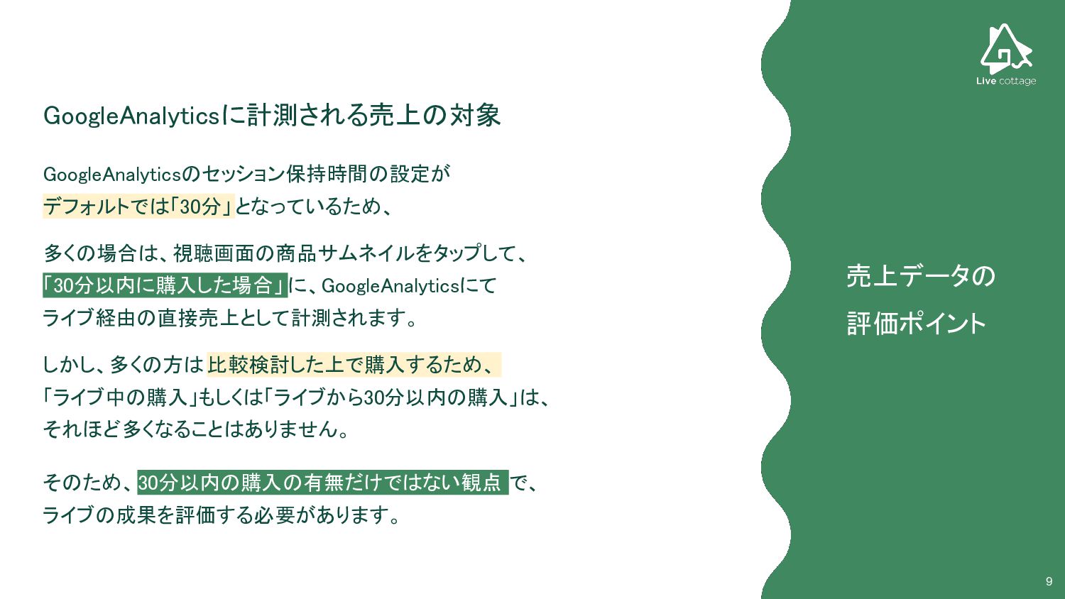 9 GoogleAnalyticsに計測される売上の対象 多くの場合は、視聴画面の商品サムネイルをタップして、 「30分以内に購入した場合」 に、GoogleAnalyticsにて ライブ経由の直接売上として計測されます。 GoogleAnalyticsのセッション保持時間の設定が