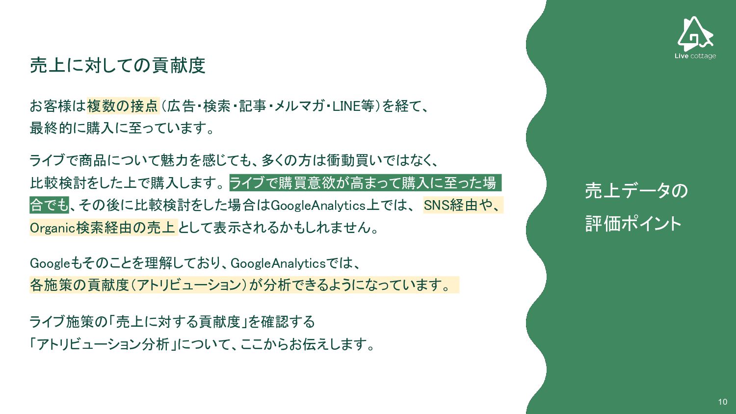 10 売上に対しての貢献度 ライブで商品について魅力を感じても、多くの方は衝動買いではなく、 比較検討をした上で購入します。 ライブで購買意欲が高まって購入に至った場 合でも、その後に比較検討をした場合はGoogleAnalytics上では、 SNS経由や、 Organic検索経由の売上 として表示されるかもしれません。