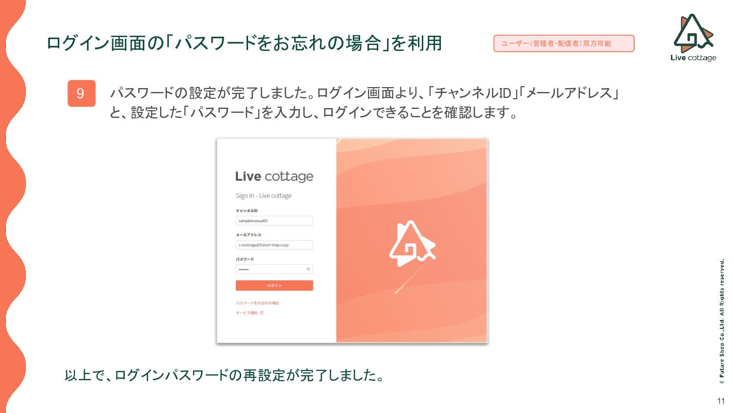 11 ログイン画面の「パスワードをお忘れの場合」を利用 パスワードの設定が完了しました。ログイン画面より、「チャンネルID」「メールアドレス」 と、設定した「パスワード」を入力し、ログインできることを確認します。 9 以上で、ログインパスワードの再設定が完了しました。