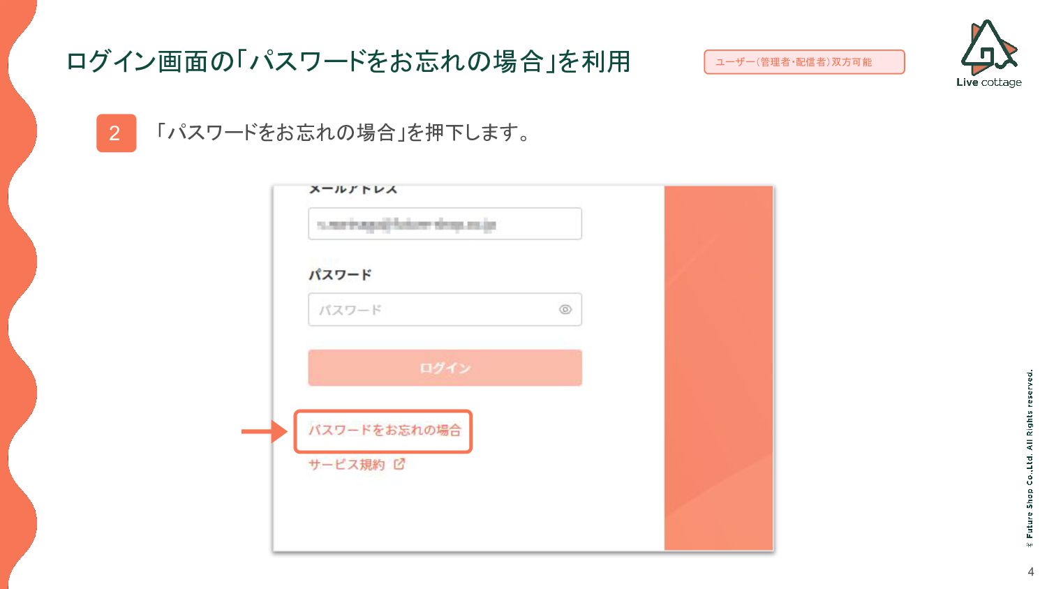 3 ログイン画面の「パスワードをお忘れの場合」を利用 Live cottage管理画面にアクセスします。 ログインURLは、スライド下をご確認ください。 1