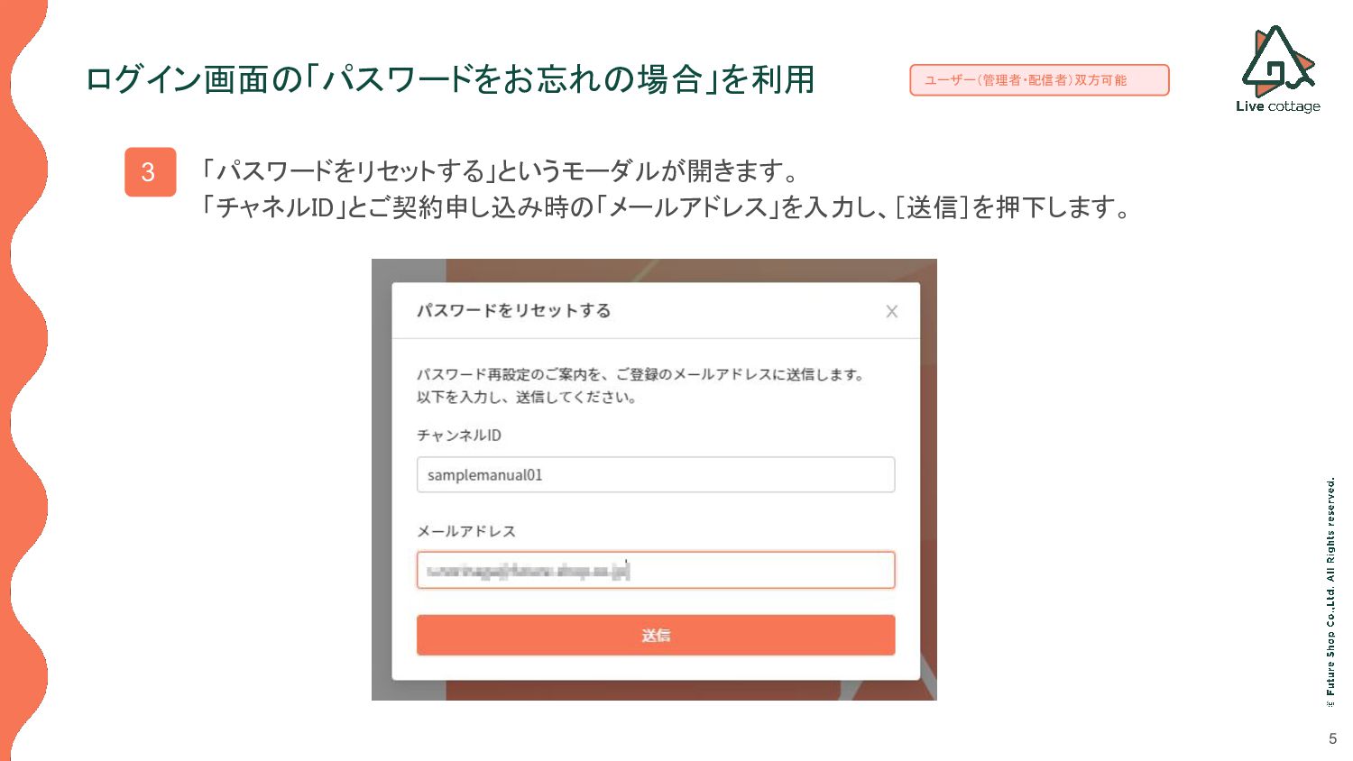 5 ログイン画面の「パスワードをお忘れの場合」を利用 「パスワードをリセットする」というモーダルが開きます。 「チャネルID」とご契約申し込み時の「メールアドレス」を入力し、[送信]を押下します。 3 ユーザー(管理者・配信者)双方可能