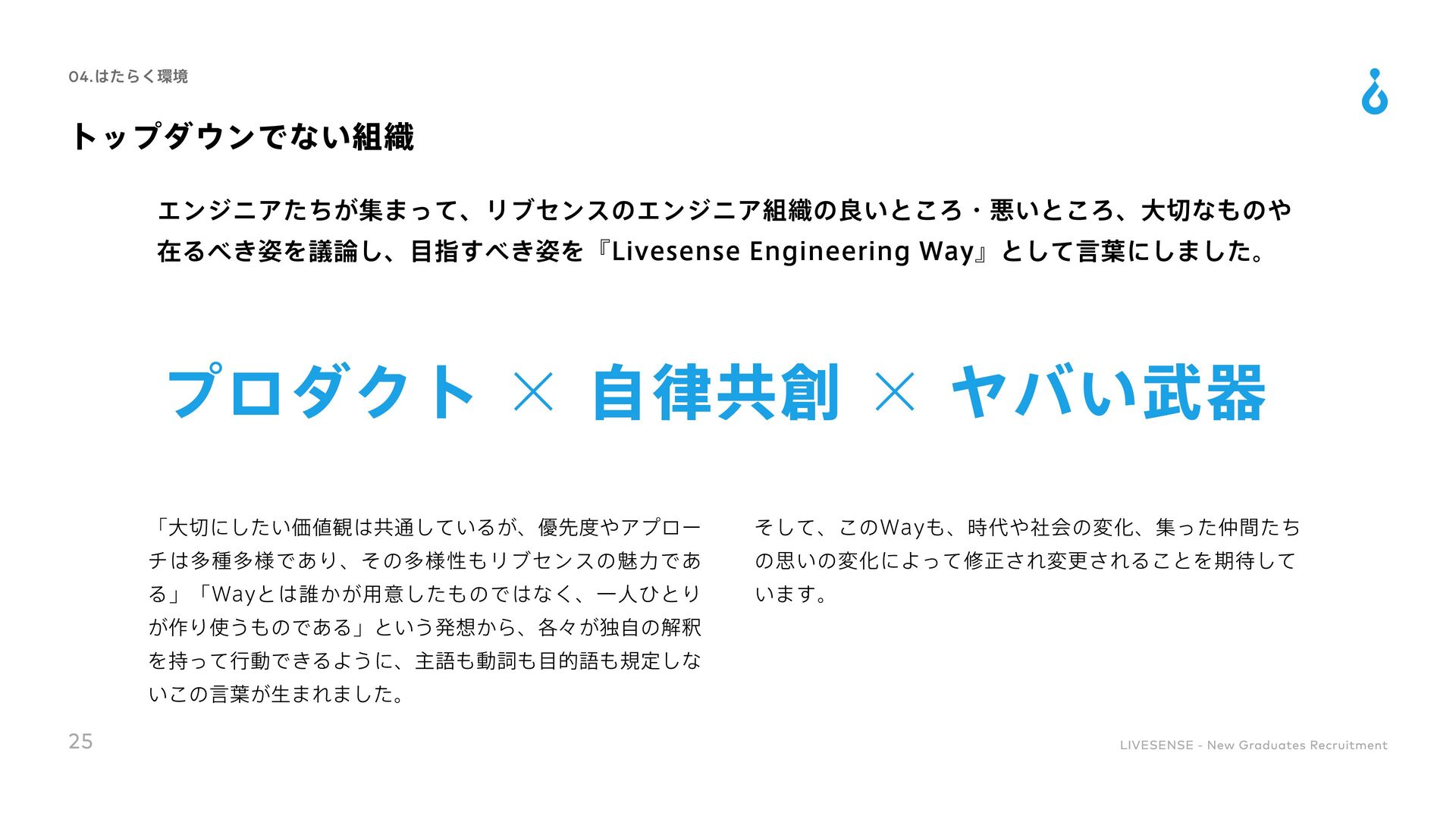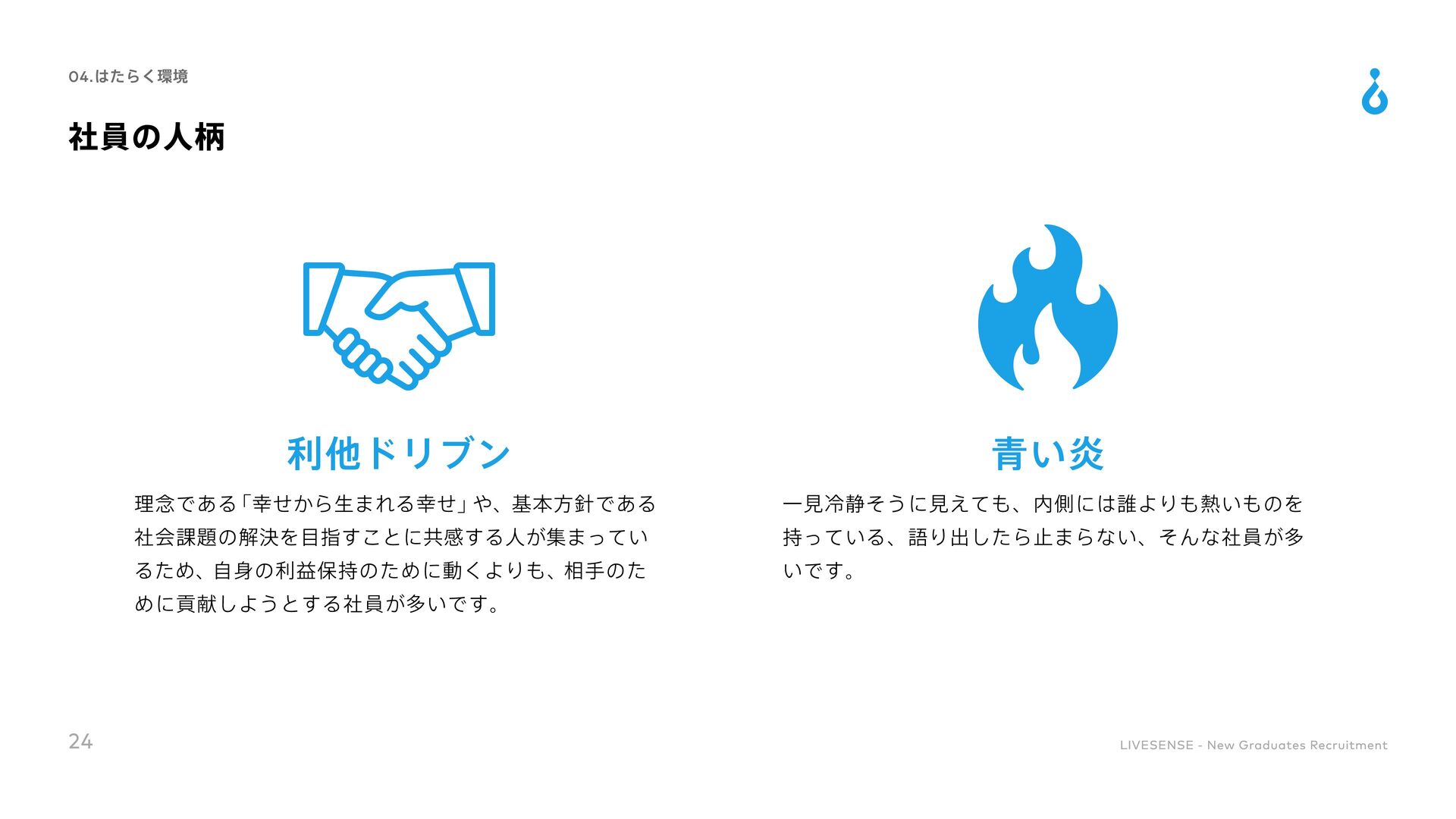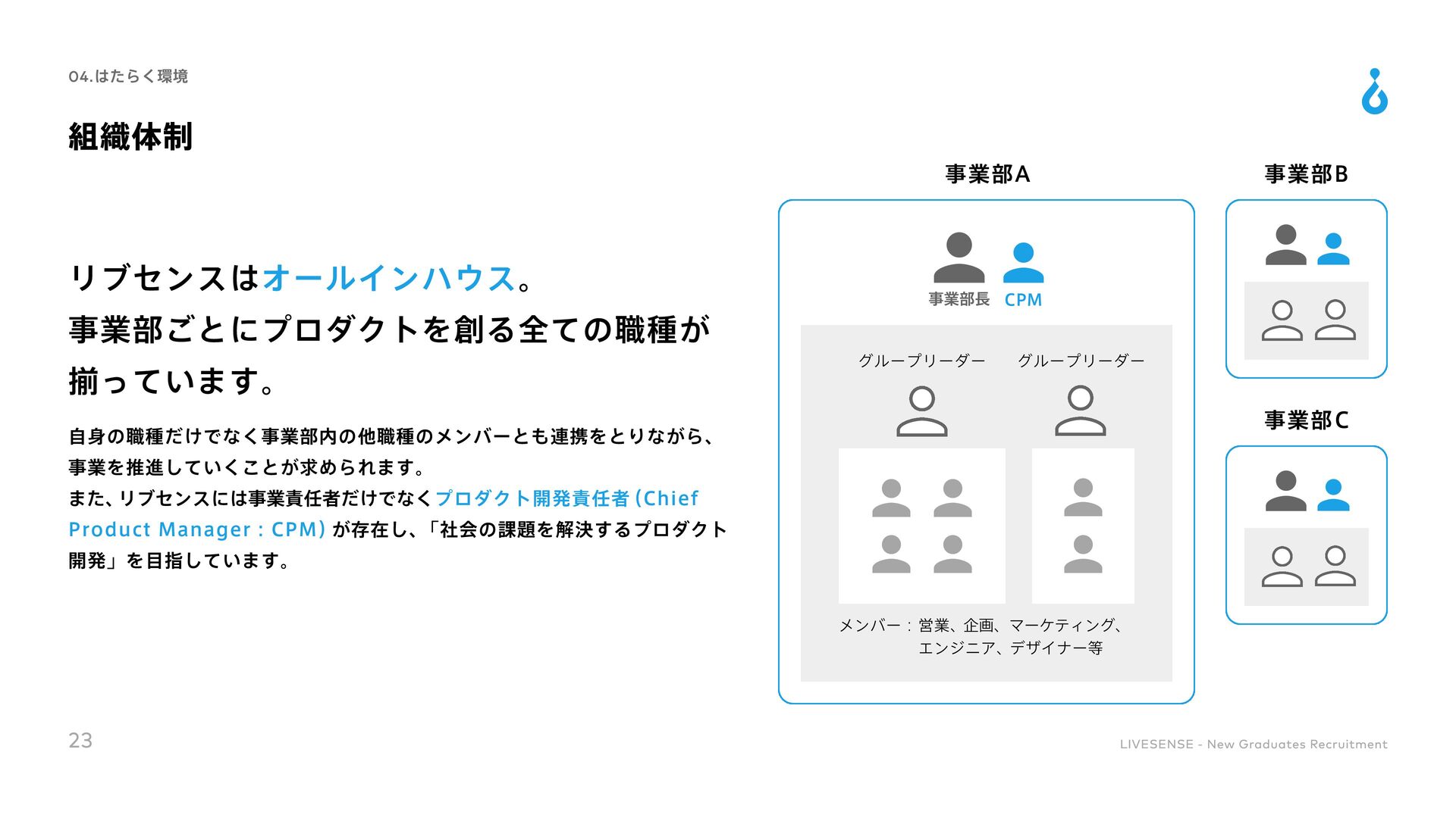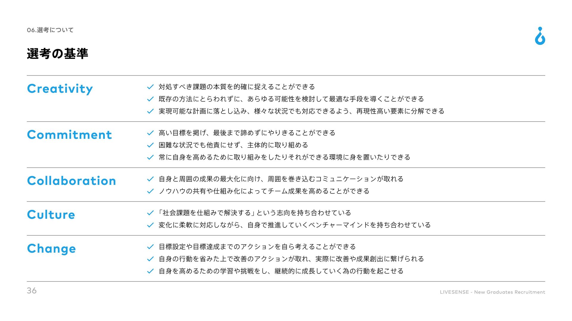 Culture Change 対処すべき課題の本質を的確に捉えることができる 既存の方法にとらわれずに、あらゆる可能性を検討して最適な手段を導くことができる 実現可能な計画に落とし込み、様々な状況でも対応できるよう、再現性高い要素に分解できる 高い目標を掲げ、最後まで諦めずにやりきることができる 困難な状況でも他責にせず、主体的に取り組める 自身と周囲の成果の最大化に向け、周囲を巻き込むコミュニケーションが取れる 「社会課題を仕組みで解決する」という志向を持ち合わせている 目標設定や目標達成までのアクションを自ら考えることができる 常に自身を高めるために取り組みをしたりそれができる環境に身を置いたりできる ノウハウの共有や仕組み化によってチーム成果を高めることができる 変化に柔軟に対応しながら、自身で推進していくベンチャーマインドを持ち合わせている 自身の行動を省みた上で改善のアクションが取れ、実際に改善や成果創出に繋げられる 自身を高めるための学習や挑戦をし、継続的に成長していく為の行動を起こせる 36