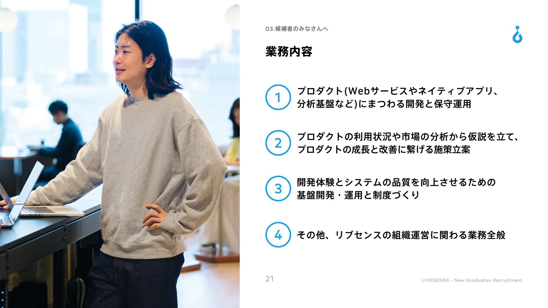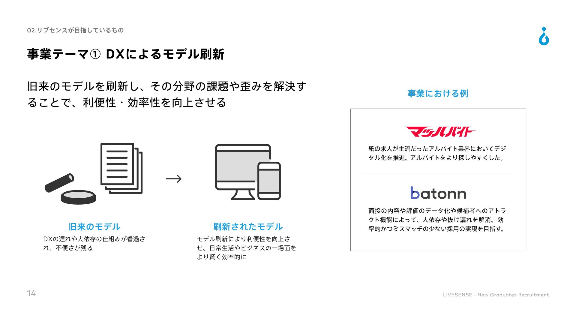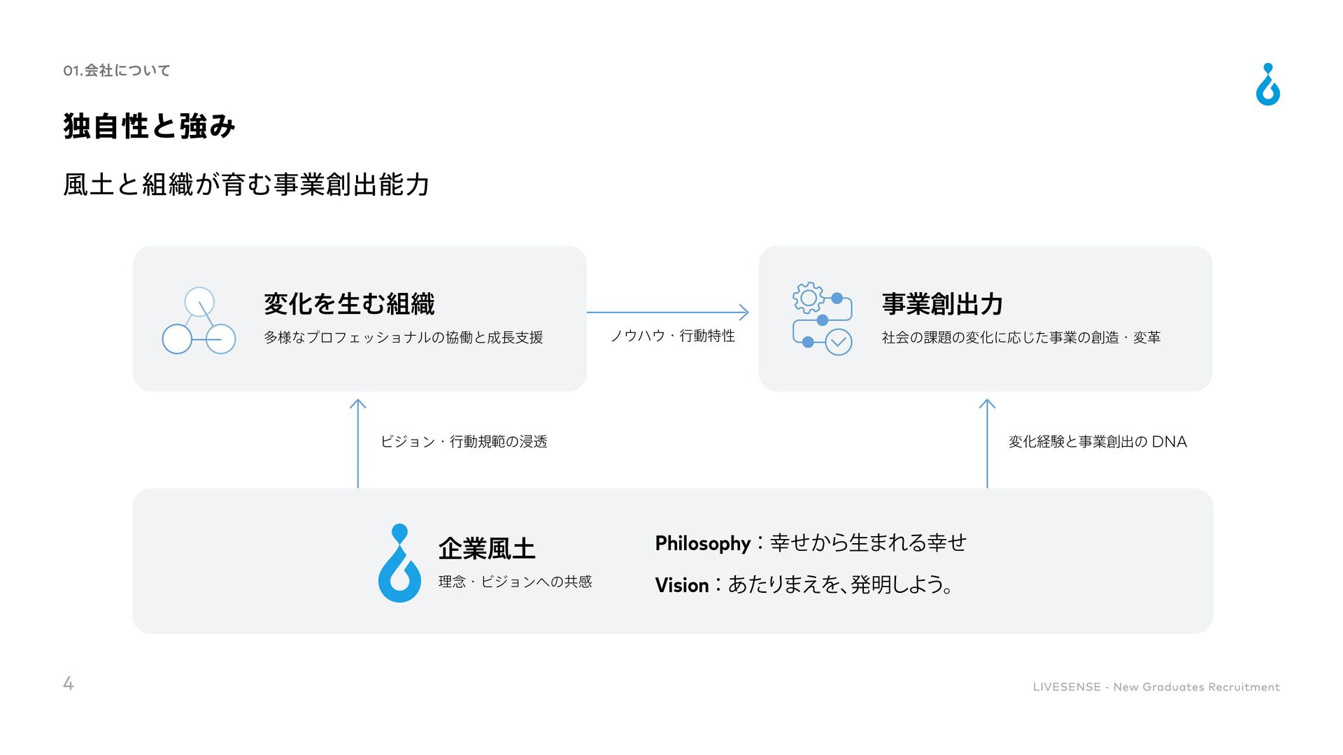 Culture Change 対処すべき課題の本質を的確に捉えることができる 既存の方法にとらわれずに、あらゆる可能性を検討して最適な手段を導くことができる 実現可能な計画に落とし込み、様々な状況でも対応できるよう、再現性高い要素に分解できる 高い目標を掲げ、最後まで諦めずにやりきることができる 困難な状況でも他責にせず、主体的に取り組める 自身と周囲の成果の最大化に向け、周囲を巻き込むコミュニケーションが取れる 「社会課題を仕組みで解決する」という志向を持ち合わせている 目標設定や目標達成までのアクションを自ら考えることができる 常に自身を高めるために取り組みをしたりそれができる環境に身を置いたりできる ノウハウの共有や仕組み化によってチーム成果を高めることができる 変化に柔軟に対応しながら、自身で推進していくベンチャーマインドを持ち合わせている 自身の行動を省みた上で改善のアクションが取れ、実際に改善や成果創出に繋げられる 自身を高めるための学習や挑戦をし、継続的に成長していく為の行動を起こせる 36