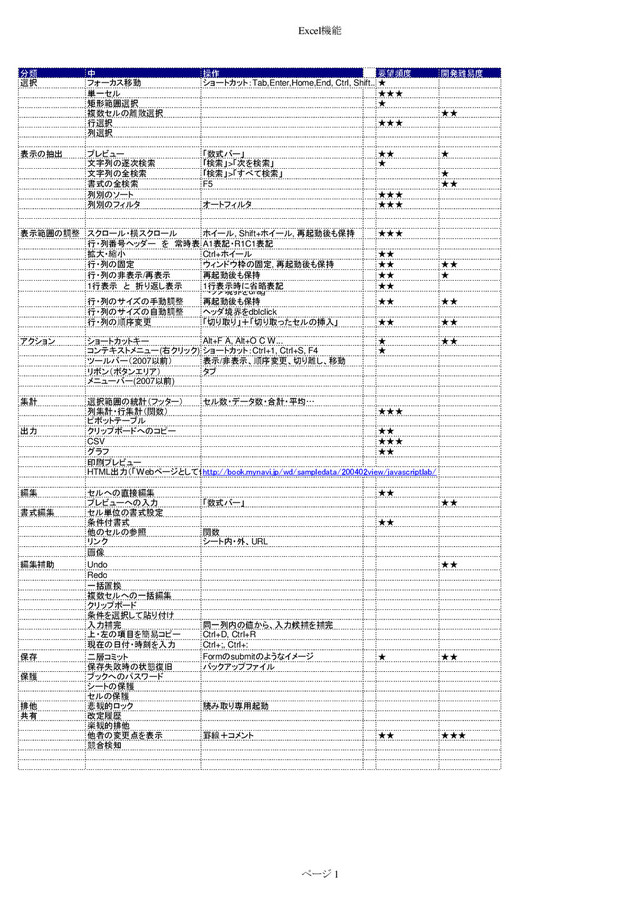 Shift...★ 単一セル ★★★ 矩形範囲選択 ★ 複数セルの離散選択 ★★ 行選択 ★★★ 列選択 表示の抽出 プレビュー 「数式バー」 ★★ ★ 文字列の逐次検索 「検索」>「次を検索」 ★ 文字列の全検索 「検索」>「すべて検索」 ★ 書式の全検索 F5 ★★ 列別のソート ★★★ 列別のフィルタ オートフィルタ ★★★ 表示範囲の調整 スクロール・横スクロール ホイール, Shift+ホイール, 再起動後も保持 ★★★ 行・列番号ヘッダー を 常時表示 A1表記・R1C1表記 拡大・縮小 Ctrl+ホイール ★★ 行・列の固定 ウィンドウ枠の固定, 再起動後も保持 ★★ ★★ 行・列の非表示/再表示 再起動後も保持 ★★ ★ 1行表示 と 折り返し表示 1行表示時に省略表記 ★★ 行・列のサイズの手動調整 ヘッダ境界をdrag 再起動後も保持 ★★ ★★ 行・列のサイズの自動調整 ヘッダ境界をdblclick 行・列の順序変更 「切り取り」+「切り取ったセルの挿入」 ★★ ★★ アクション ショートカットキー Alt+F A, Alt+O C W... ★ ★★ コンテキストメニュー(右クリック) ショートカット:Ctrl+1, Ctrl+S, F4 ★ ツールバー(2007以前) 表示/非表示、順序変更、切り離し、移動 リボン(ボタンエリア) タブ メニューバー(2007以前) 集計 選択範囲の統計(フッター) セル数・データ数・合計・平均… 列集計・行集計(関数) ★★★ ピボットテーブル 出力 クリップボードへのコピー ★★ CSV ★★★ グラフ ★★ 印刷プレビュー HTML出力(「Webページとして保存」) http://book.mynavi.jp/wd/sampledata/200402view/javascriptlab/ 編集 セルへの直接編集 ★★ プレビューへの入力 「数式バー」 ★★ 書式編集 セル単位の書式設定 条件付書式 ★★ 他のセルの参照 関数 リンク シート内・外、URL 画像 編集補助 Undo ★★ Redo 一括置換 複数セルへの一括編集 クリップボード 条件を選択して貼り付け 入力補完 同一列内の値から、入力候補を補完 上・左の項目を簡易コピー Ctrl+D, Ctrl+R 現在の日付・時刻を入力 Ctrl+;, Ctrl+: 保存 二層コミット Formのsubmitのようなイメージ ★ ★★ 保存失敗時の状態復旧 バックアップファイル 保護 ブックへのパスワード シートの保護 セルの保護 排他 悲観的ロック 読み取り専用起動 共有 改定履歴 楽観的排他 他者の変更点を表示 罫線+コメント ★★ ★★★ 競合検知 ページ 1