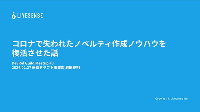 コロナで失われたノベルティ作成ノウハウを 復活させた話 DevRel Guild Meetup #3 2024.02.27 転職ドラフト事業部 岩⽥泰明 Copyright