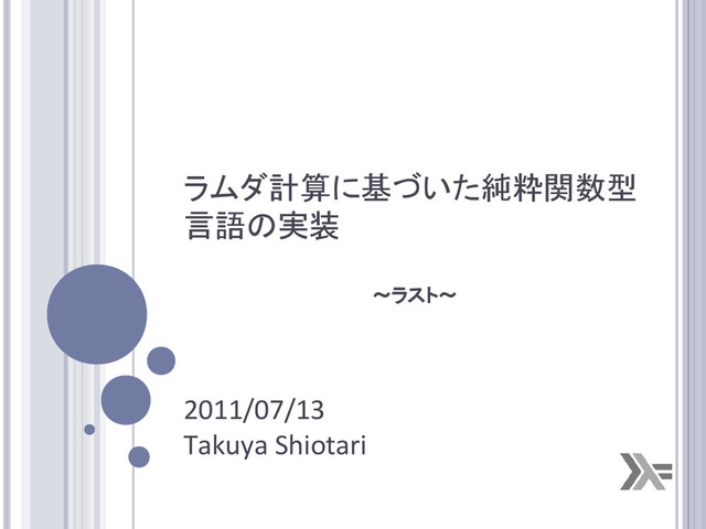 ラムダ計算に基づいた純粋関数型 言語の実装 2011/07/13 Takuya Shiotari ~ラスト~