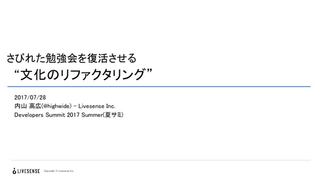 さびれた勉強会を復活させる “文化のリファクタリング” 2017/07/28 内山 高広(@highwide) - Livesense Inc. Developers Summit