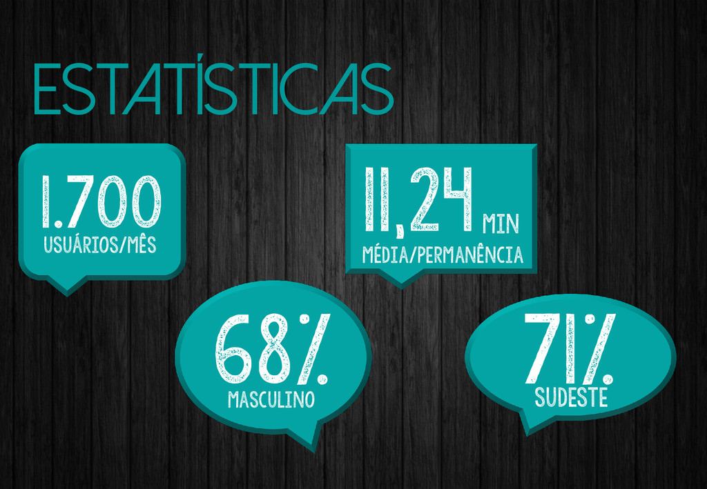 estatísticas 68% usuários/mês masculino média/permanência 71% sudeste 1.700 11,24 min