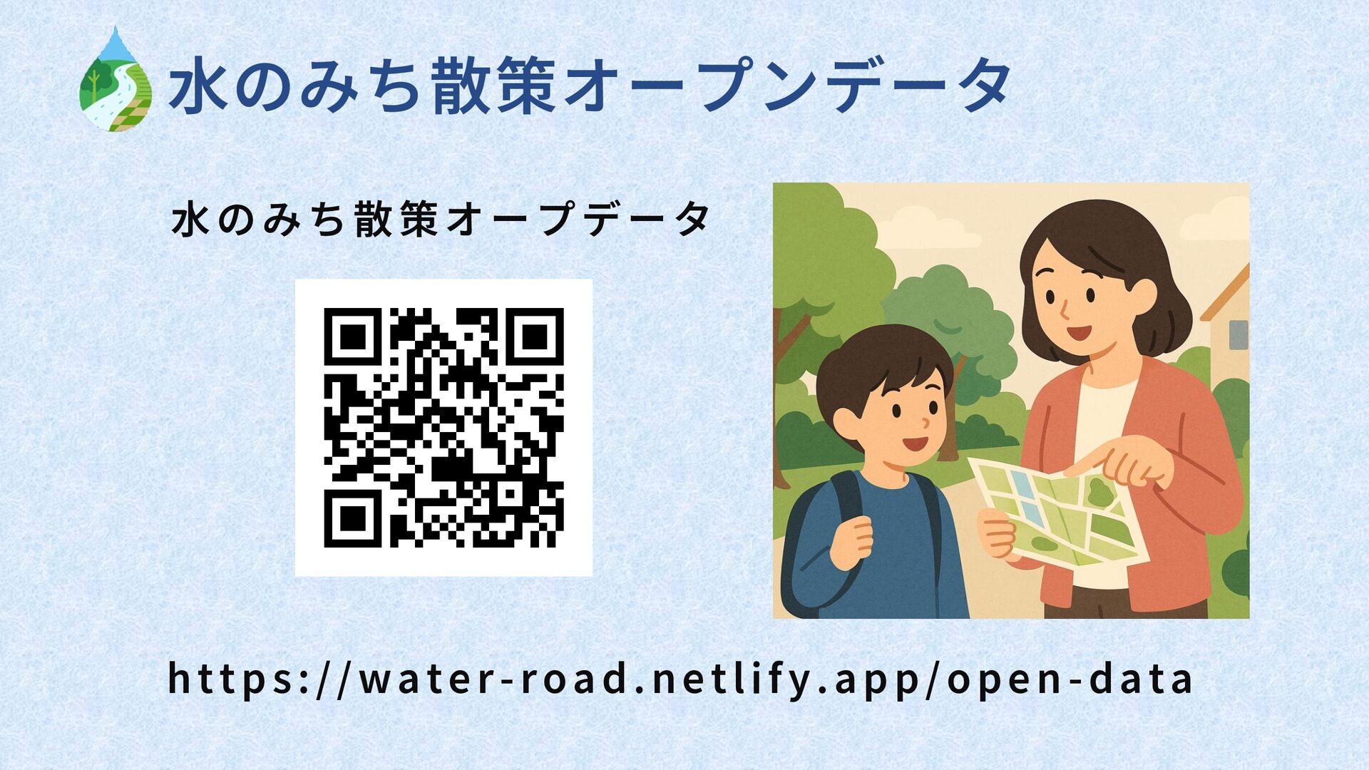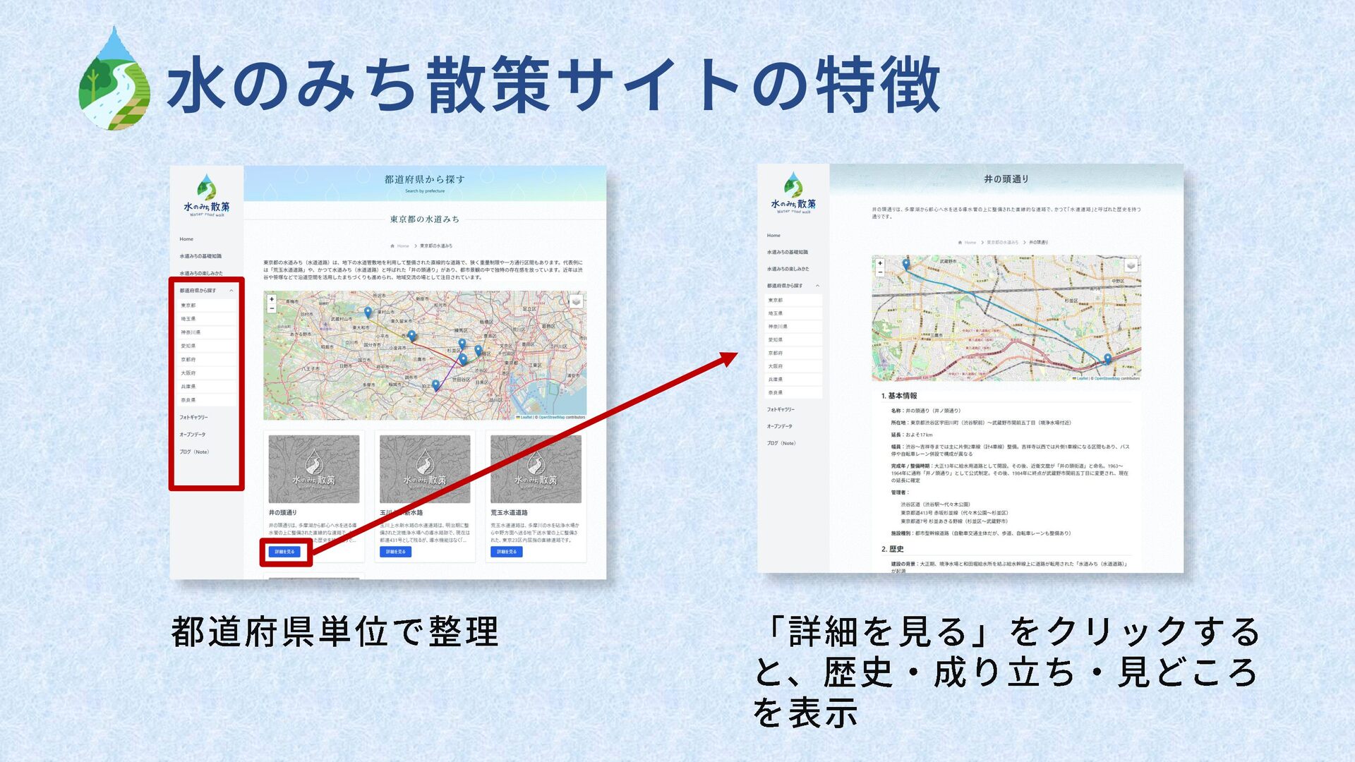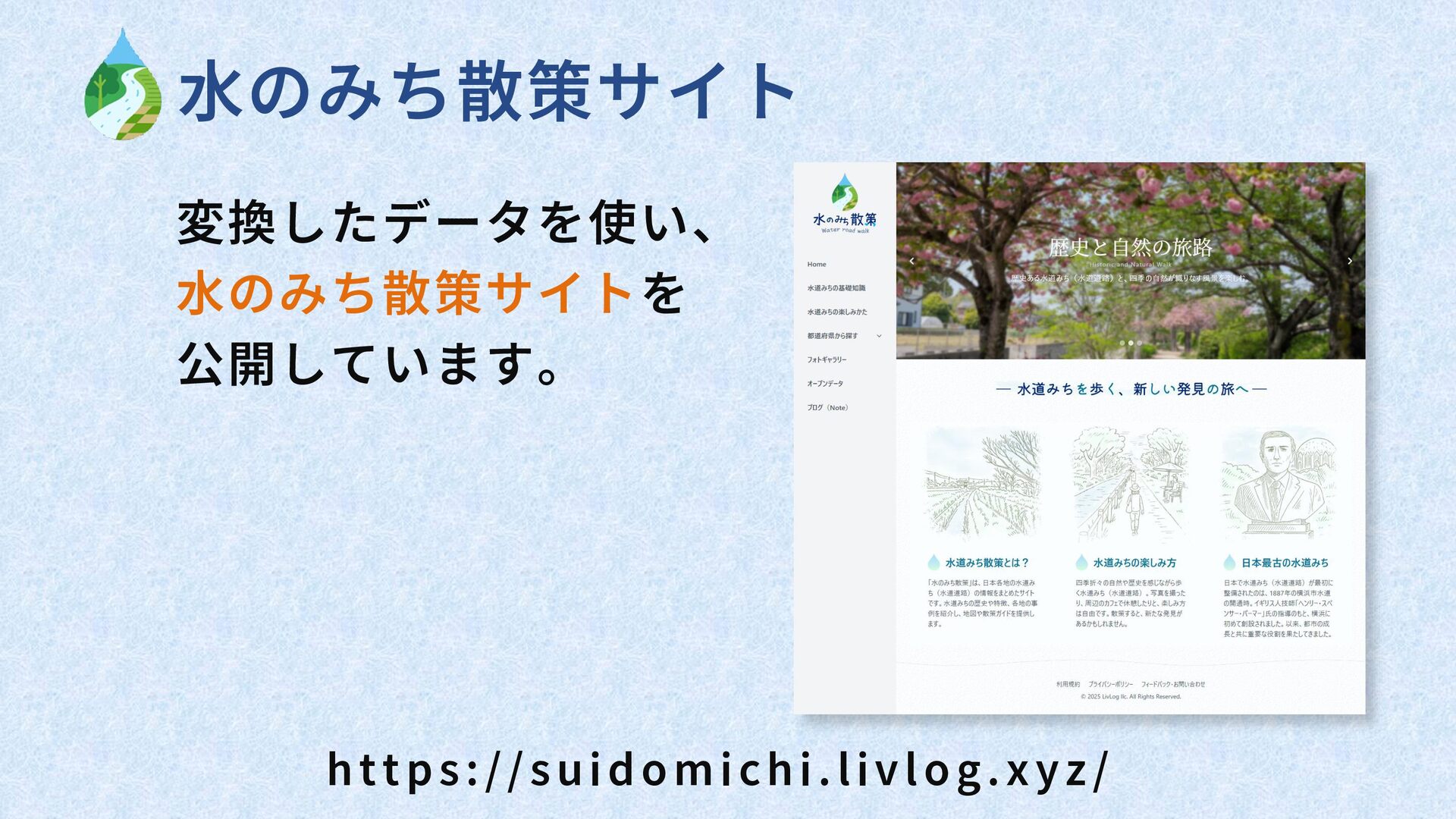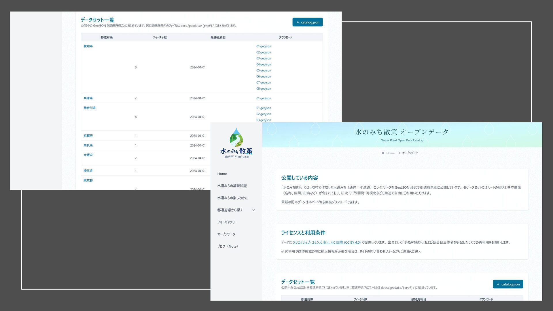 ・水のみち散策サイトで公開し、都道府県別のGeoJSONデータを提供。