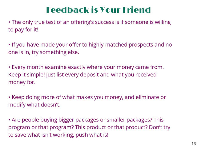 to get clarity on which offerings are making you money and which you need to change or eliminate. Keep it simple! Group similar offerings together and round your numbers. This is not an all day math exercise, you just want a quick snapshot of your income. Use whatever time frame you like, or try filling out the sheet with different time frames: past month, past 6 months, past year. The offering revenue is your total revenue for that time period for each individual offering. In the example below we had 5 clients buying 10 hours each at $100 per hour, every month for the past 6 months. 10 hours x $100 per hour = $1,000 x 5 clients = $5,000 x 6 months = $30,000. To get your percentage of total revenue, divide one offering’s revenue by your entire sum revenue. In the example below we take $30,000 (coaching revenue) and divide by $32,000 (total revenue for 6 months) to get .9375, 93.75% which we rounded to 94%. A sample sheet is included, with a full empty sheet for you fill in. 17