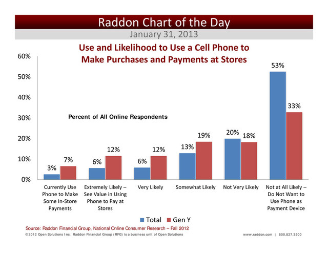 business unit of Open Solutions Inc. www.raddon.com | 800.827.3500 Source: Raddon Financial Group, National Online Consumer Research – Fall 2012 Raddon Chart of the Day January 29, 2013 Most Valued Mobile Wallet Features 20% 22% 25% 24% 26% 27% 28% 27% 27% 28% 27% 33% 36% 37% 37% 38% 38% 38% 39% 39% 0% 10% 20% 30% 40% 50% Access/Control Childs Accounts Make In-Store Purchases Receive Offers Based on Buying Patterns Make Online Purchases Calendar to Track Spending View Multiple Account Information Receive Offers Based on Location Organize/Track Rewards Use Phone as ID Pay Bills Percent Citing Extremely to Very Valuable Smartphone Owners Total