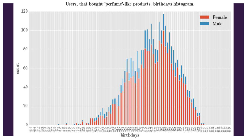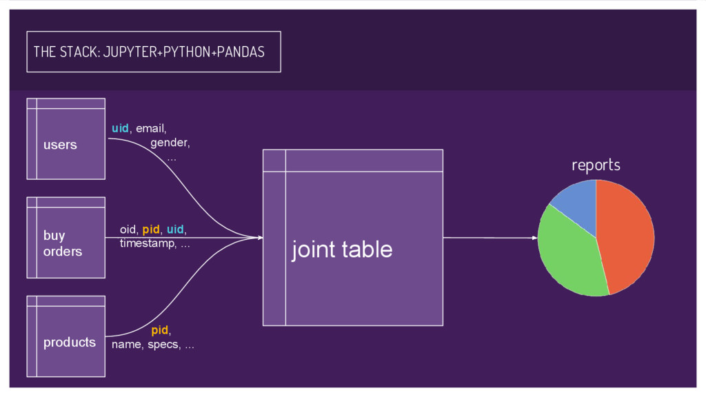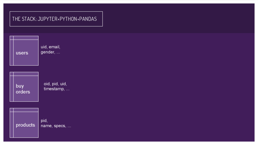 ... pid, name, specs, ... uid, email, gender, ... oid, uid, pid, email, gender, timestamp, name, specs, ... THE STACK: JUPYTER+PYTHON+PANDAS