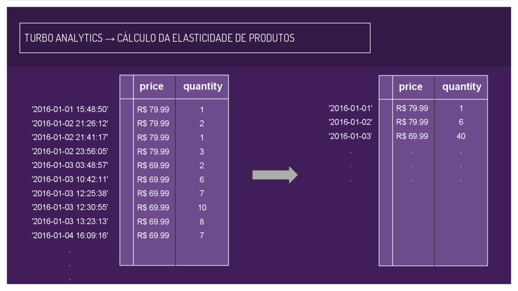 '2016-01-01 15:48:50' '2016-01-02 21:26:12' '2016-01-02 21:41:17' '2016-01-02 23:56:05' '2016-01-03 03:48:57' '2016-01-03 10:42:11' '2016-01-03 12:25:38' '2016-01-03 12:30:55' '2016-01-03 13:23:13' '2016-01-04 16:09:16' . . . 1 2 1 3 2 6 7 10 8 7 R$ 79.99 R$ 79.99 R$ 79.99 R$ 79.99 R$ 69.99 R$ 69.99 R$ 69.99 R$ 69.99 R$ 69.99 R$ 69.99 price quantity '2016-01-01' '2016-01-02' '2016-01-03’ . . . 1 6 40 . . . R$ 79.99 R$ 79.99 R$ 69.99 . . .