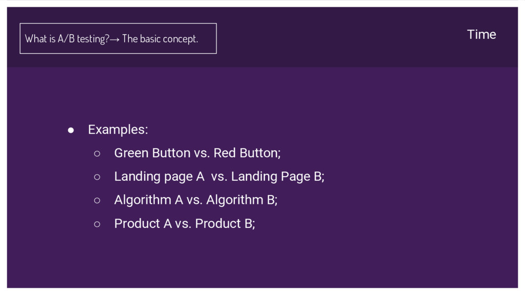 ◦ Green Button vs. Red Button; ◦ Landing page A vs. Landing Page B; ◦ Algorithm A vs. Algorithm B; ◦ Product A vs. Product B;