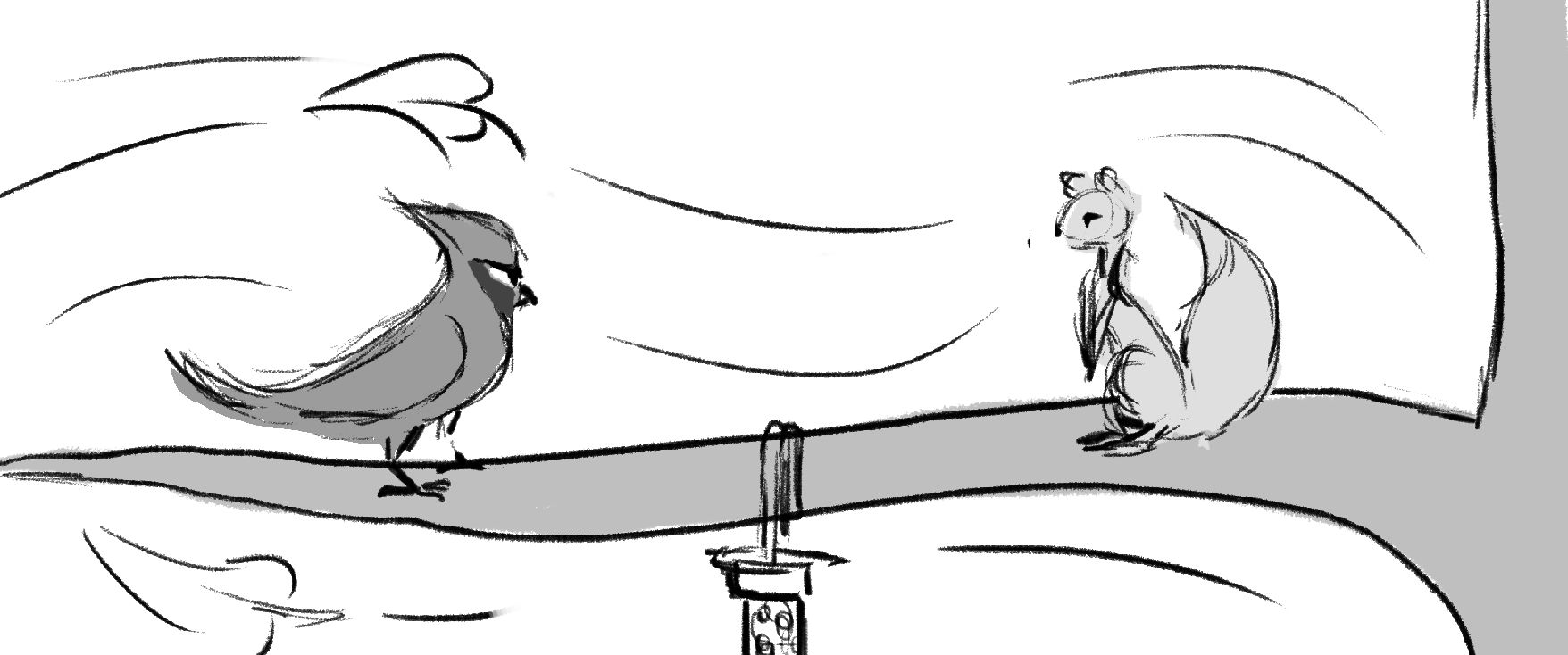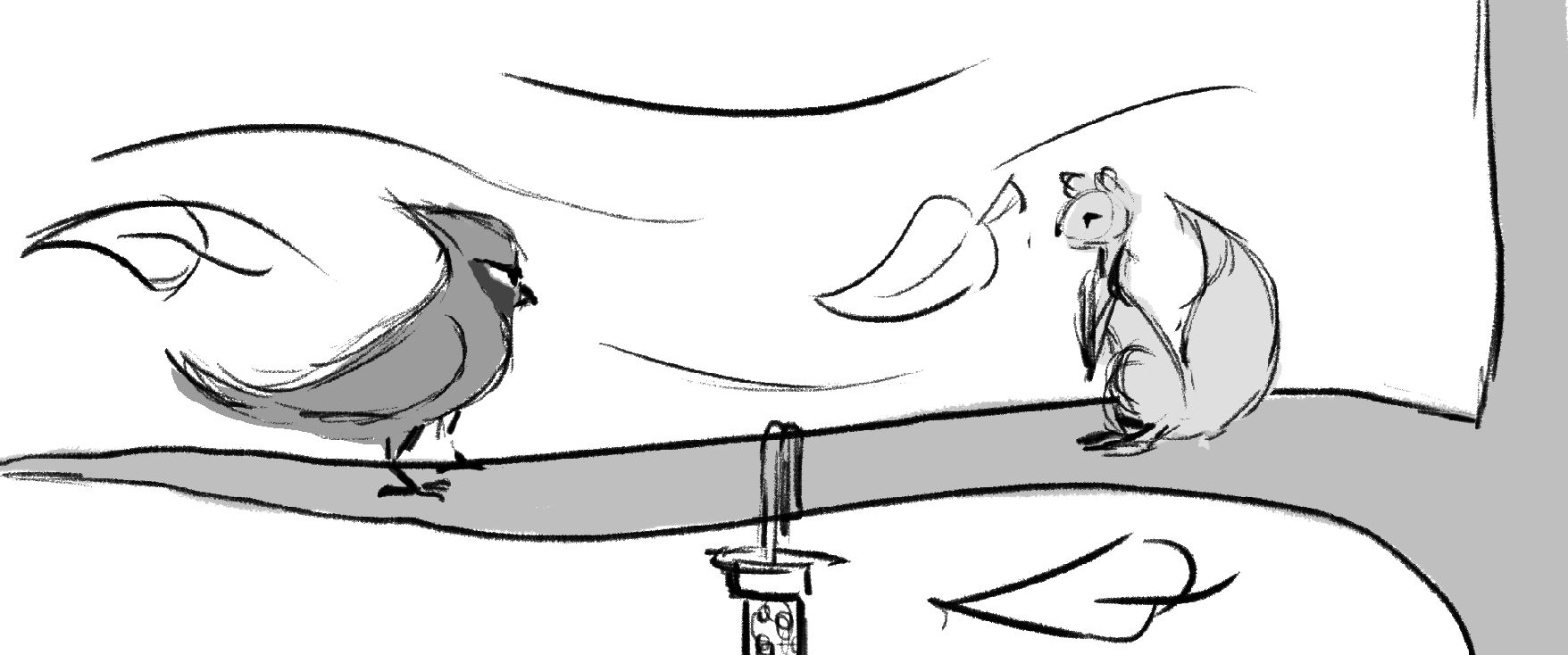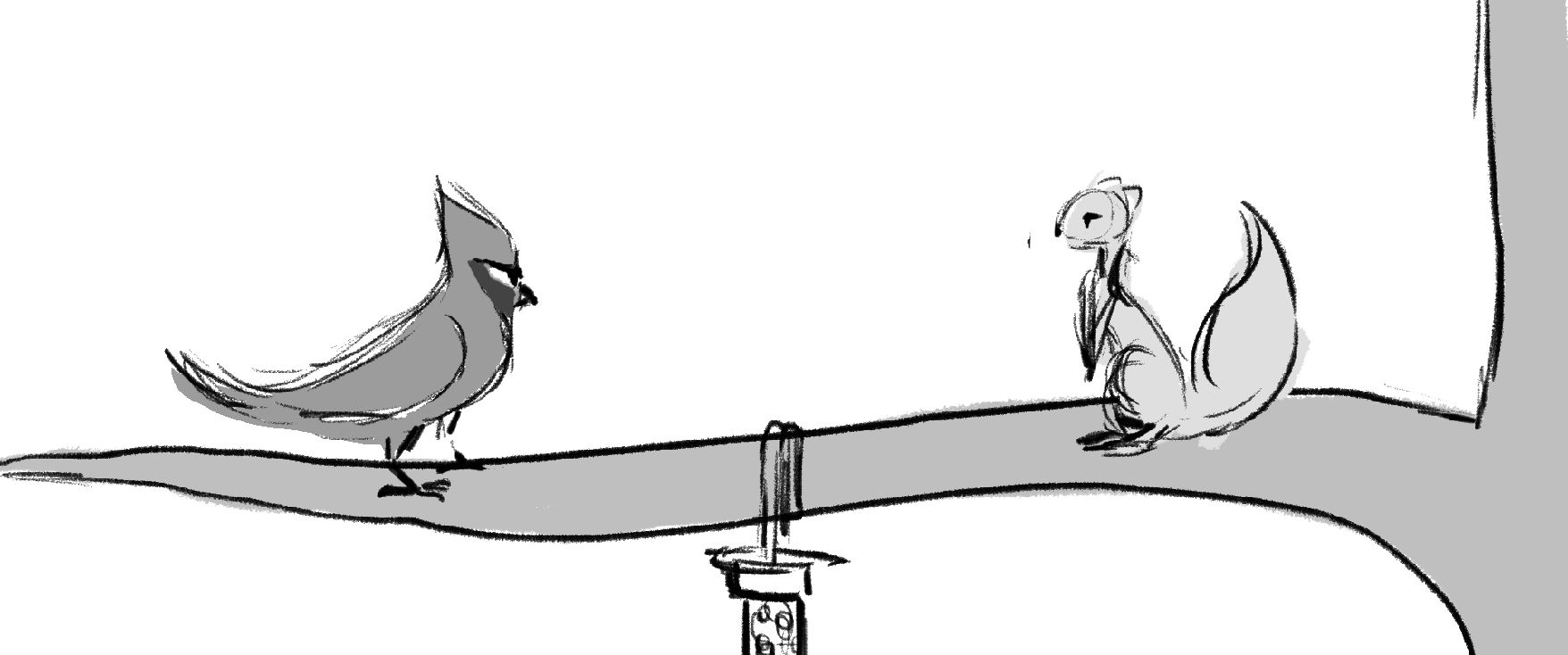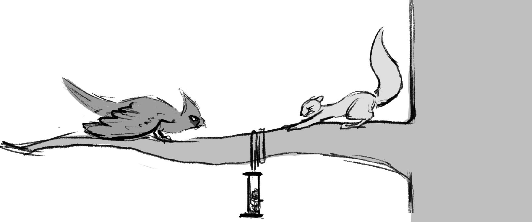 A squirrel has a showdown against a Cardinal to see who will claim the birdfeeder as their own.